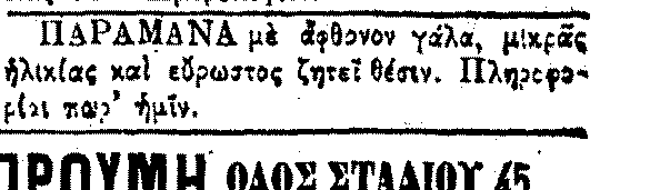 , διαφημίζοντας την ικανότητά τους στον θηλασμό όπως στην παρακάτω αγγελία των αρχών του 20ου αιώνα :«Παραμάνα έχουσα υγιές και άφθονον γάλα, ζητεί οικίαν ως θηλάστρα». Η μόδα αυτή ξεπερνιέται με τα χρόνια με αποτέλεσμα, μόλις το 1919, εφημερίδα σε πρωτοσέλιδο χρονογράφημά με τίτλο: «Η παρακμή της τροφού» να την αποζητά κατηγορώντας παράλληλα τους νέους «αμερικάνικους» τρόπους θηλασμού :«Είναι το ωμέγα του νεωτερισμού. Τας είπε γαλακτοδοχεία. Και είναι πράγματι. Ομοιάζουν με τα αμαξάκια διανομής του γάλακτος, τα οποία διαθέτουν τα διάφορα βουστάσια δια τους πελάτας. Μοιράζουν το προϊόν των εδώ και τώρα εκεί, με ένα κέρδος τόσο ή τόσο. Είναι έμποροι. Και το εμπόριον δεν έχει αισθήματα. Ουδεμία και ουδείς ενθυμείτε την τροφόν του».