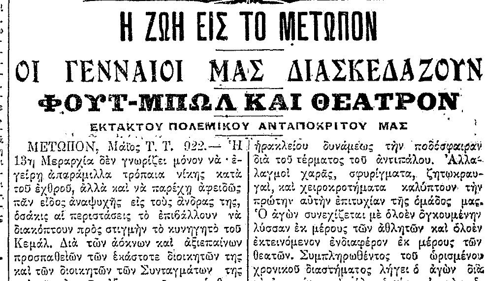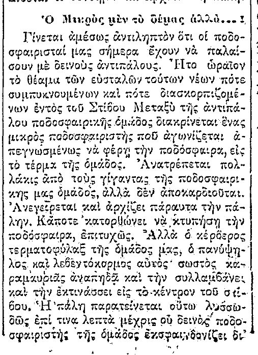 «Ήτον ωραίο το θέαμα των ευσταλών ετούτων νέων, πότε συμπυκνωμένων και πότε διασκορπιζομένων εντός του Σταδίου. (…)Κάποτε κατορθώνει να πετύχει την ποδόσφαιρα επιτυχώς. Αλλά ο κέρβερος τερματοφύλαξ της ομάδας μας, ο πανύψηλος και λεβεντόκορμος αυτός καταμαυριάς, αναπηδά, την συλλαμβάνει και την εκτινάσσει εις το κέντρο του στίβου. Η πάλη παρατείνεται ούτω λυσσωδώς επί τινά λεπτά μέχρις ου δεινώς ποδοσφαιριστής της ομάδος εκσφενδονίζει μετά ηρακλείου δυνάμεως την ποδόσφαιραν δια του τέρματος του αντιπάλου. Ο αγών συνεχίζεται με ολοέναν διογκούμενην λύσσαν εκ μέρους των αθλητών και ολοένα εκτεινόμενον ενδιαφέρον εκ μέρους των θεατών».