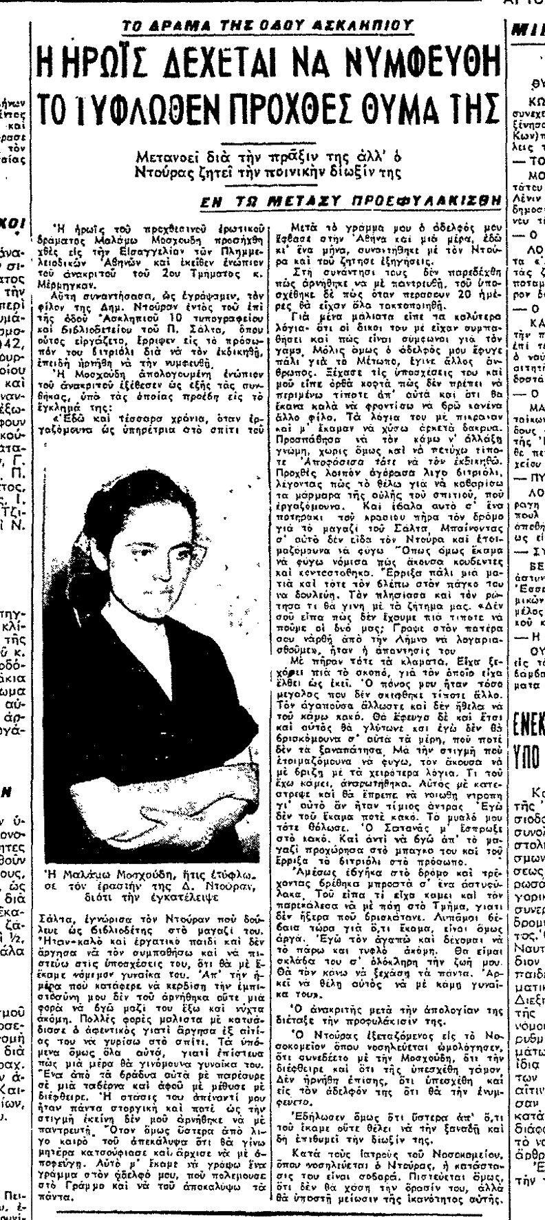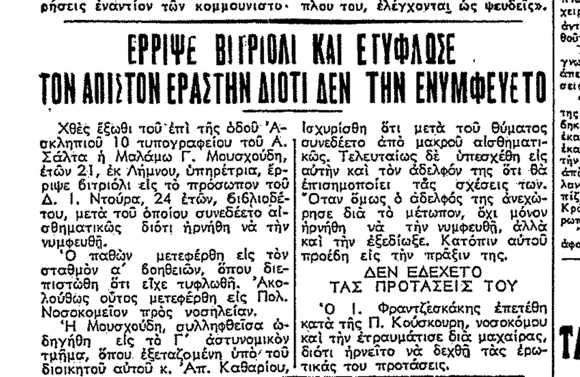 » 1952: 33χρονη μητέρα έξι παιδιών στην Πάτρα πετά βιτριόλι στο πρόσωπο 23χρονης, όταν μαθαίνει πως η τελευταία διατηρεί σχέση με τον σύζυγό της. Λίγους μήνες μετά, πάλι στην Πάτρα, νεαρή, αφού πρώτα πετά βάζο στο κεφάλι του φίλου της, εν συνεχεία τον περιλούζει με βιτριόλι. Τον Σεπτέμβριο 21χρονη υπηρέτρια στο Μαρούσι ρίχνει βιτριόλι στον πρώην φίλο της, που γλιτώνει την τελευταία στιγμή τρέχοντας. Αιτία της πράξης της είναι η αθέτηση της υπόσχεσης γάμου έπειτα από τρίχρονη σχέση γεμάτη ένταση, όπου οι ρόλοι θύτη και θύματος εναλλάσσονται μεταξύ τους. Κατά την κατάθεσή της η κοπέλα όχι μόνο εμφανίζεται αμετανόητη, αλλά τονίζει ότι, όταν αποφυλακιστεί, θα προσπαθήσει εκ νέου… Την ίδια χρονιά στο Αίγιο, φοιτητής, ύστερα από επίθεση με βιτριόλι που δέχεται από κοπέλα, νοσηλεύεται σε σοβαρή κατάσταση, ενώ χάνει το ένα του μάτι.