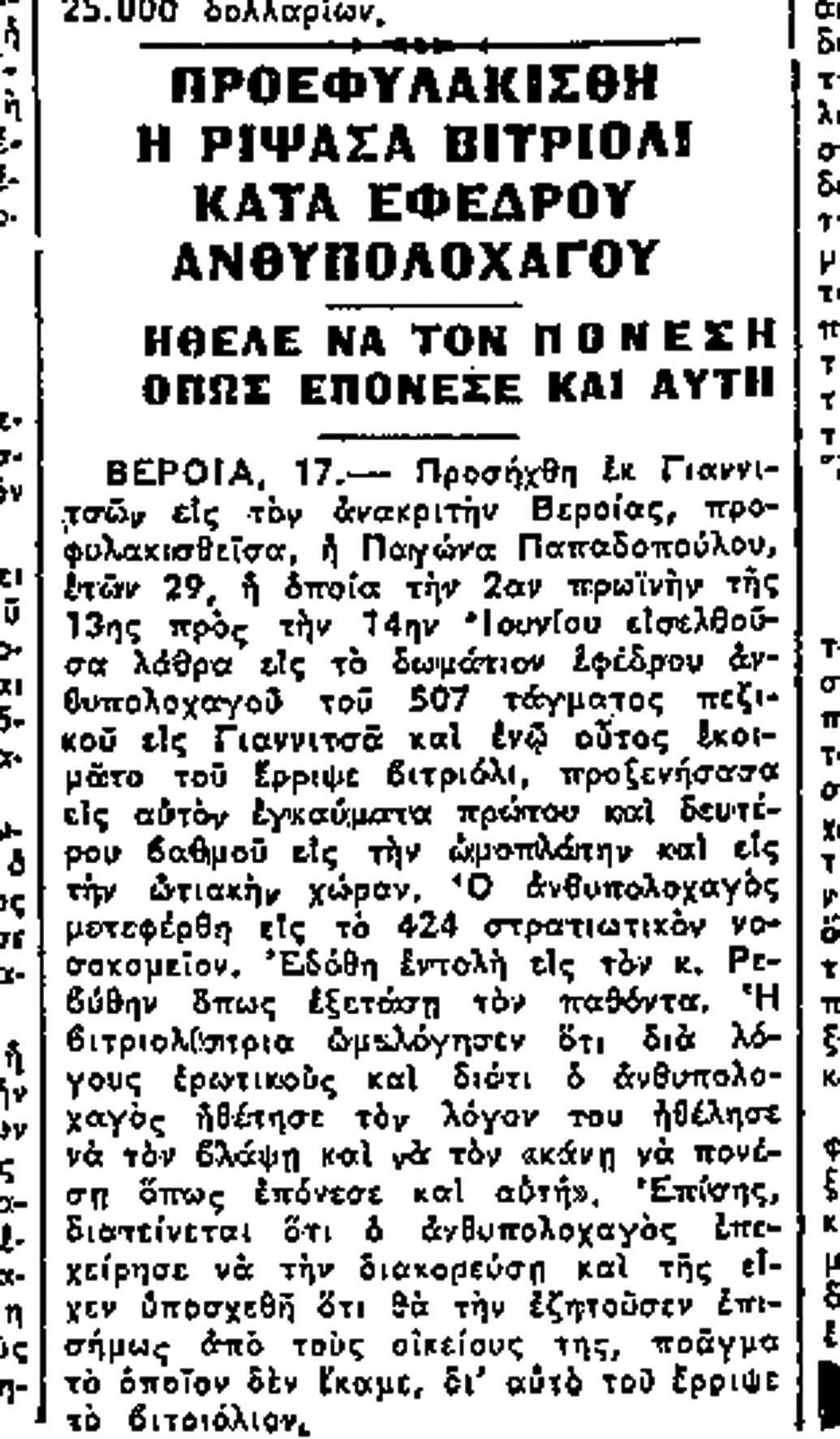 » 1950: 22χρονη εργάτρια κεραμοποιείου στην Κοζάνη ρίχνει, για λόγους ζηλοτυπίας, βιτριόλι στο πρόσωπο του εραστή της, που βρίσκονται μαζί δύο χρόνια, και εν συνεχεία στο δικό της, με αποτέλεσμα τη νοσηλεία και των δύο με βαριά εγκαύματα. Το ίδιο έτος τριαντάχρονη καταδικάζεται σε φυλάκιση 4½ ετών, γιατί τυφλώνει με βιτριόλι τον φίλο της, όταν ο τελευταίος αρνείται να την παντρευτεί.