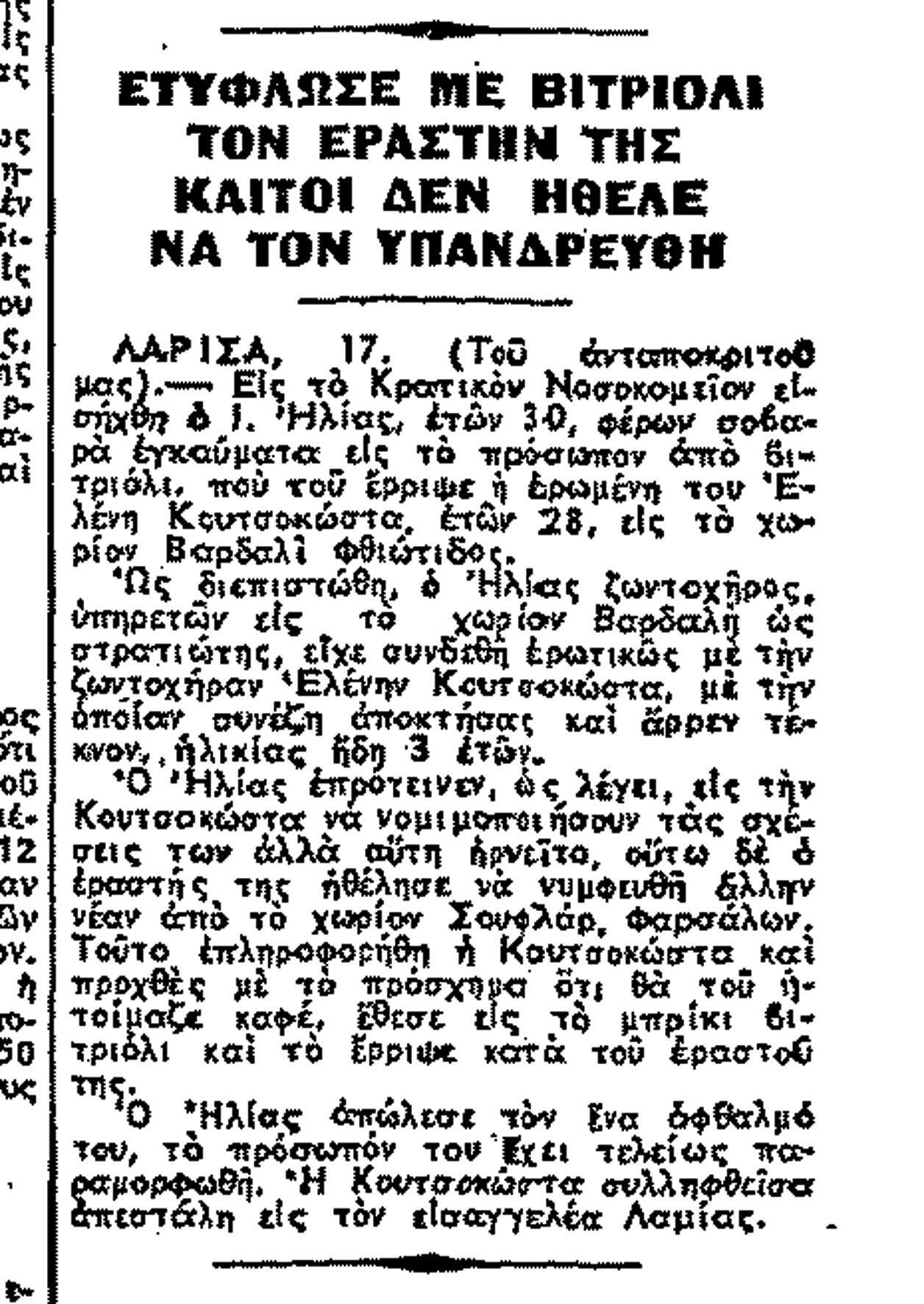 » 1953: Τον Ιανουάριο στη Λάρισα 30χρονη ρίχνει βιτριόλι στο πρόσωπο του εραστή της επειδή ο τελευταίος αθετεί υπόσχεση γάμου. Δύο μήνες μετά, 26χρονη με πέντε παιδιά σε χωριό της Ηλείας τυφλώνει με βιτριόλι τον φίλο της «…επειδή ούτος διέκοψε τας μετ’ αυτής ερωτικάς σχέσεις του». Τον Μάιο του ίδιου έτους 19χρονη ρίχνει φιάλη με βιτριόλι στον μνηστήρα της, γιατί την εγκαταλείπει μετά την εγκυμοσύνη της. Τον Ιούλιο στη Λαμία το ίδιο κάνει 22χρονη στον 35χρονο εραστή της προκαλώντας του βαριά εγκαύματα στα μάτια και σε όλο του το σώμα, γιατί την εγκαταλείπει και αρραβωνιάζεται με άλλη. Τον Νοέμβριο νεαρή αποπειράται να ρίξει βιτριόλι στον φίλο της, που την έχει εγκαταλείψει μερικές ημέρες πριν. Τον Δεκέμβριο 18χρονη βιτριολίστρια δικάζεται στον Βόλο για την τύφλωση με βιτριόλι του φίλου της, ο οποίος την είχε απαγάγει, την εγκατέλειψε και «τη συκοφάντησεν ως ανήθικον». Παρότι οι ένορκοι την αθωώνουν δεχόμενοι την υπερασπιστική γραμμή ότι βρισκόταν σε πλήρη σύγχυση, ο εισαγγελέας διαφωνεί και ζητά επανάληψη της δίκης.