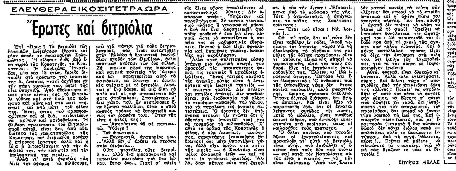 » 1954: Νεαρή στην Αιγιαλεία ρίχνει βιτριόλι στον φίλο της, αυτήν τη φορά όχι για ερωτικούς αλλά για οικονομικούς λόγους, κάνοντας τον δημοσιογράφο να σχολιάζει: «Ας χαιρετίσουμε την καινούργια αφορμή που ανοίγει νέους ορίζοντες στη γυναικεία δράση. Διότι, όπως πάνε τα πράγματα, δεν θα μπορεί κανείς ν’ αρνηθεί ένα καινούργιο φουστάνι στη γυναίκα του, λόγω φόβου βιτριολιού». Τον Ιούλιο εικόνες από την ταινία «Ο πόλεμος των Ρόουζ» εξελίσσονται στο Αγρίνιο, όταν 28χρονη μητέρα τριών παιδιών ρίχνει βιτριόλι στο πρόσωπο του εραστή της, αλλά αυτός αντιδρά κάνοντας κι εκείνος το ίδιο, με τον δημοσιογράφο να σχολιάζει ότι «έβγαλαν τα μάτια τους»… Τον Σεπτέμβριο της ίδιας χρονιάς 24χρονη αυτοκτονεί με βιτριόλι, όταν οι δικοί της δεν την αφήνουν να παντρευτεί μοναχό, με τον δημοσιογράφο να σημειώνει με ακραία ειρωνεία μπροστά στην απώλεια ενός νέου ανθρώπου με φρικτό τρόπο: «Τι του εζήλεψε του καλόγερου η 24χρονη Τριανταφυλλιά; Το βρώμικο ράσο του ή την αξιοθρήνητη αξυρισιά του; Αλλωστε, όταν θα τον ενυμφεύετο, ο καλόγερος θα έπαυε να είναι μοναχός»…