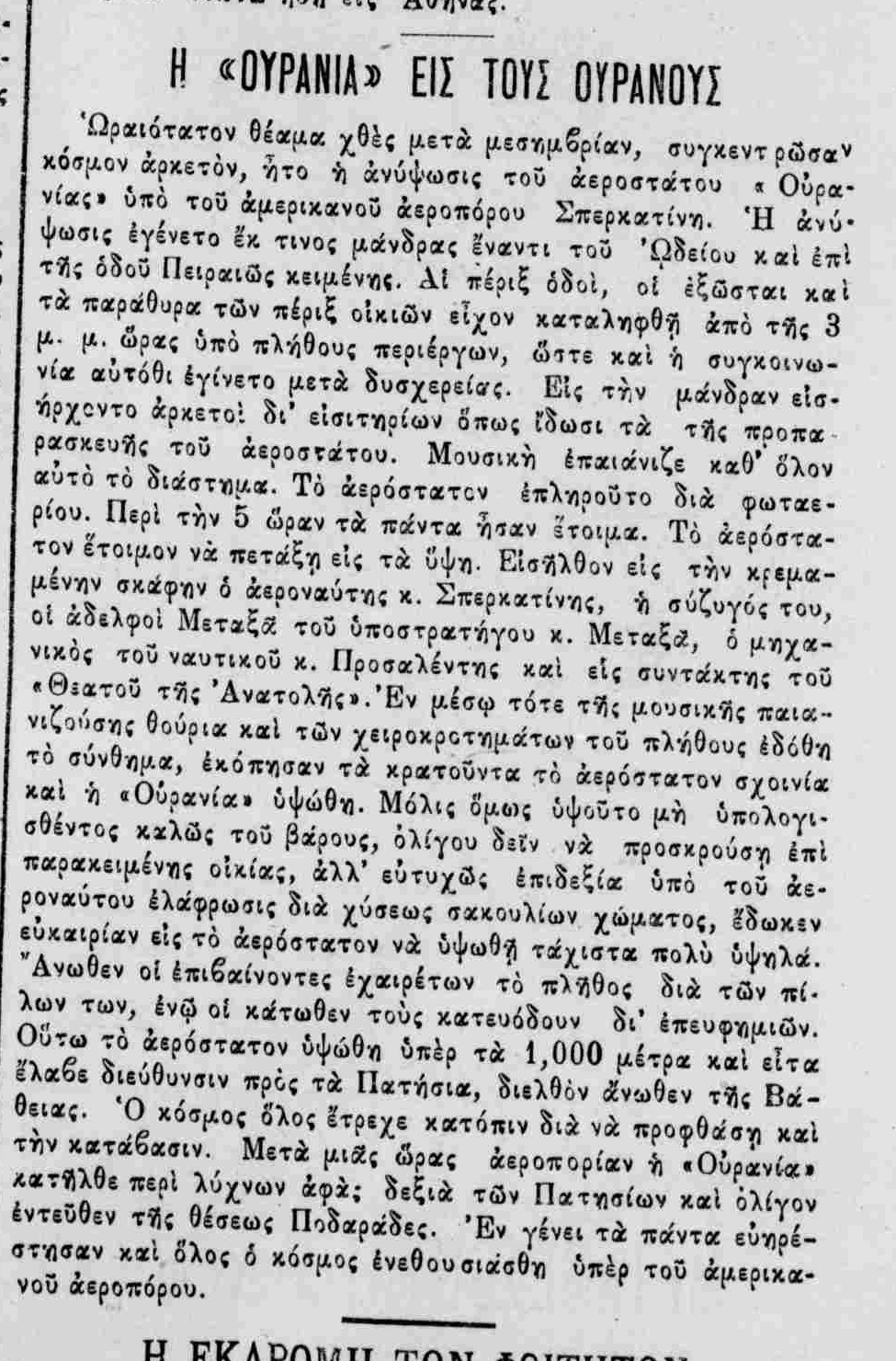 Η δεύτερη πτήση μοιάζει να είναι περισσότερο εντυπωσιακή, ίσως γιατί διανθίζεται από το αερο-ρεπορτάζ του Νικολάου Σπανδωνή, δημοσιογράφου της εφημερίδας «Ακρόπολις», που βρίσκεται στο αερόστατο.