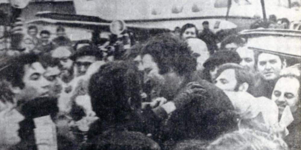 Εκεί, τον περιμένουν διακόσιοι δημοσιογράφοι και άλλοι τόσοι Έλληνες ενώ πέφτει στην αγκαλιά της Μελίνας Μερκούρη που κλαίει. Στις πρώτες δηλώσεις η σύζυγός του Μυρτώ αναφέρει :«Δεν έχω συνέλθει ακόμα από τη χαρά μου. Ήταν τόσο ευχάριστο και τόσο ξαφνικό. Παρότι είμαι ζαλισμένη από τη χαρά μου, του συνέστησα να πάει κατευθείαν στο νοσοκομείο να κοιταχτεί».