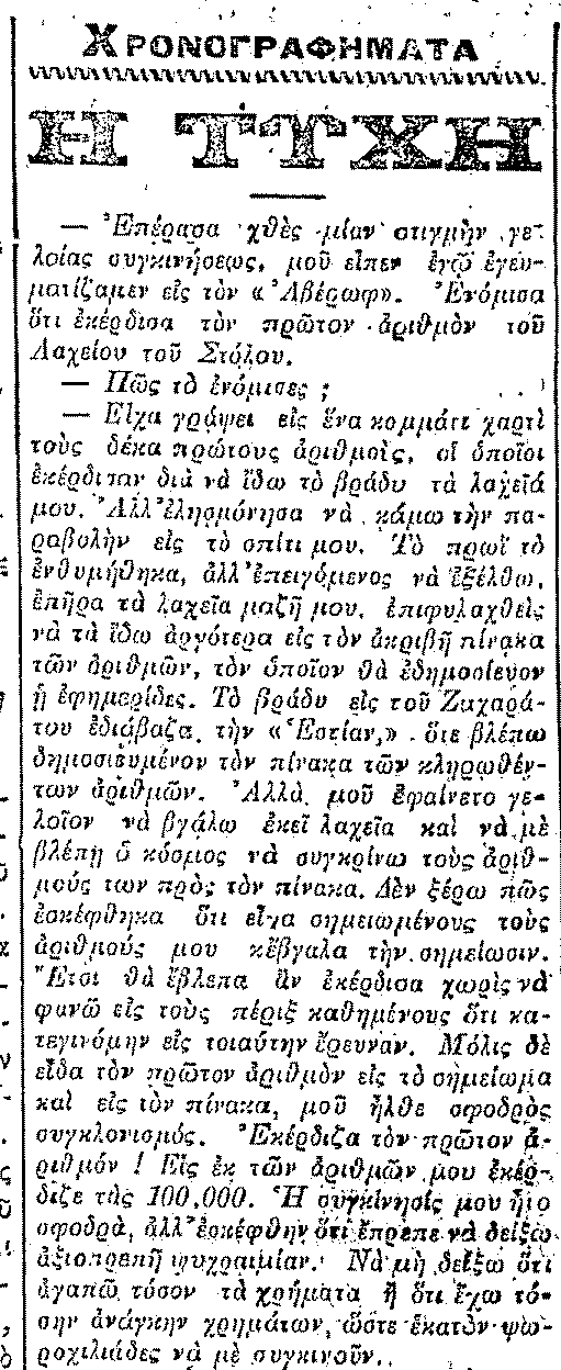 «Εις μιαν στιγμήν επέρασε μια σειρά σκέψεων από τον εγκεφαλόν μου. Πως θα παρουσιαζόμουν εις τον κ. Κοφινάν (Σ.Σ προϊστάμενος του «Γραφείου του Λαχείου» που υπήρχε στο υπουργείο Οικονομικών) και τι θα του έλεγα, αν έπρεπε να σπεύσω ή να βραδύνω δια να μη δείξω ότι αποδίδω υπερβολικήν σημασίαν εις το κέρδος. Έπειτα εφοβήθην μήπως με προλάβει κανείς πλαστογράφος και γεννηθούν ζητήματα και αναβολές και μπλεξιές. Όχι, θα πήγαινα το πρωί της επιούσης και ει δυνατόν θα ήμουν ο πρώτος επισκέπτης του κ. Κοφινά. Εκατό χιλιάδες !Δεν ήτο και μικρόν το ποσόν. Ηδύνατο να εξασφαλίσει μιαν μετριόφρονα ευτυχίαν εις ένα άνθρωπον, ο οποίος δεν έχει υπερβολικούς πόθους. Εις μιαν στιγμήν εσκέφθηκα και πως θα εχρησιμοποίουν αυτόν τον πλούτον, δια να μη κινδυνεύσω να τα χάσω. Πόσα πράγματα δύναται να σκεφθεί ο άνθρωπος εις ένα λεπτόν, όταν η σκέψις κινείται με τον ατμόν της συγκινήσεως !».