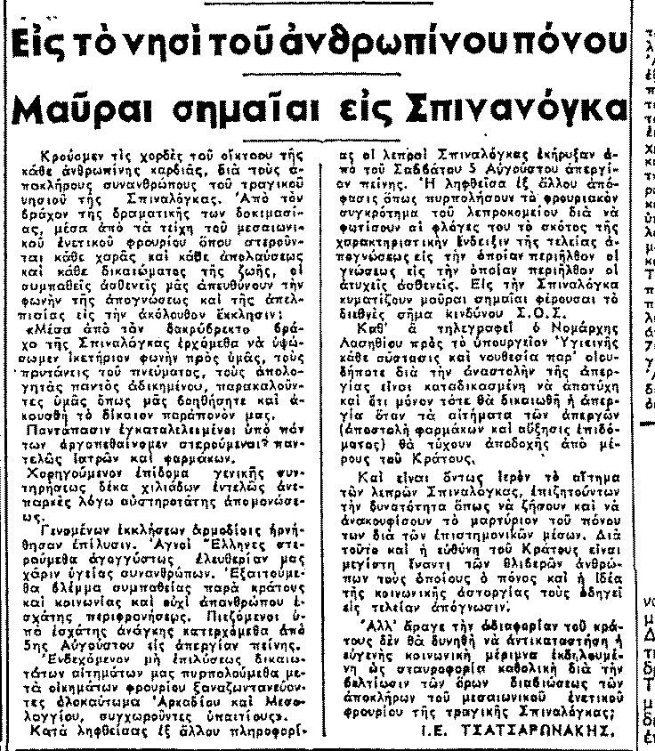 «Μέσα από τον δακρύβρεκτο βράχο της Σπιναλόγκας ερχόμαστε να υψώσουμε ικετήριον φωνήν προς υμάς, του πρυτάνεις του πνεύματος, τους απολογητάς παντός αδικημένου, παρακαλούντες ημάς όπως μας βοηθήσετε και ακουστεί το δίκαιον παραπονόν μας. Παντάπασιν εγκαταλελειμμένοι υπό πάντων αργοπεθαίνουμε στερούμενοι παντελώς ιατρών και φαρμάκων. Χορηγουμένων επίδομα γενικής συντηρήσεως δέκα χιλιάδων εντελώς ανεπαρκές λόγω αυστηρότατης απομονώσεως.
