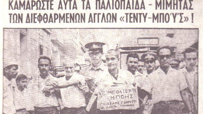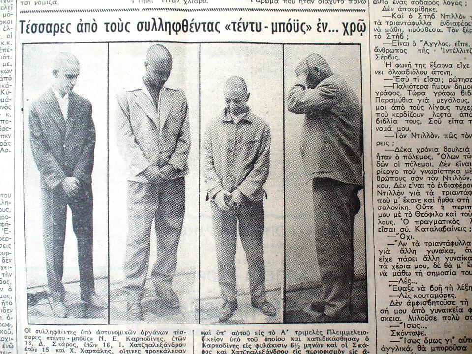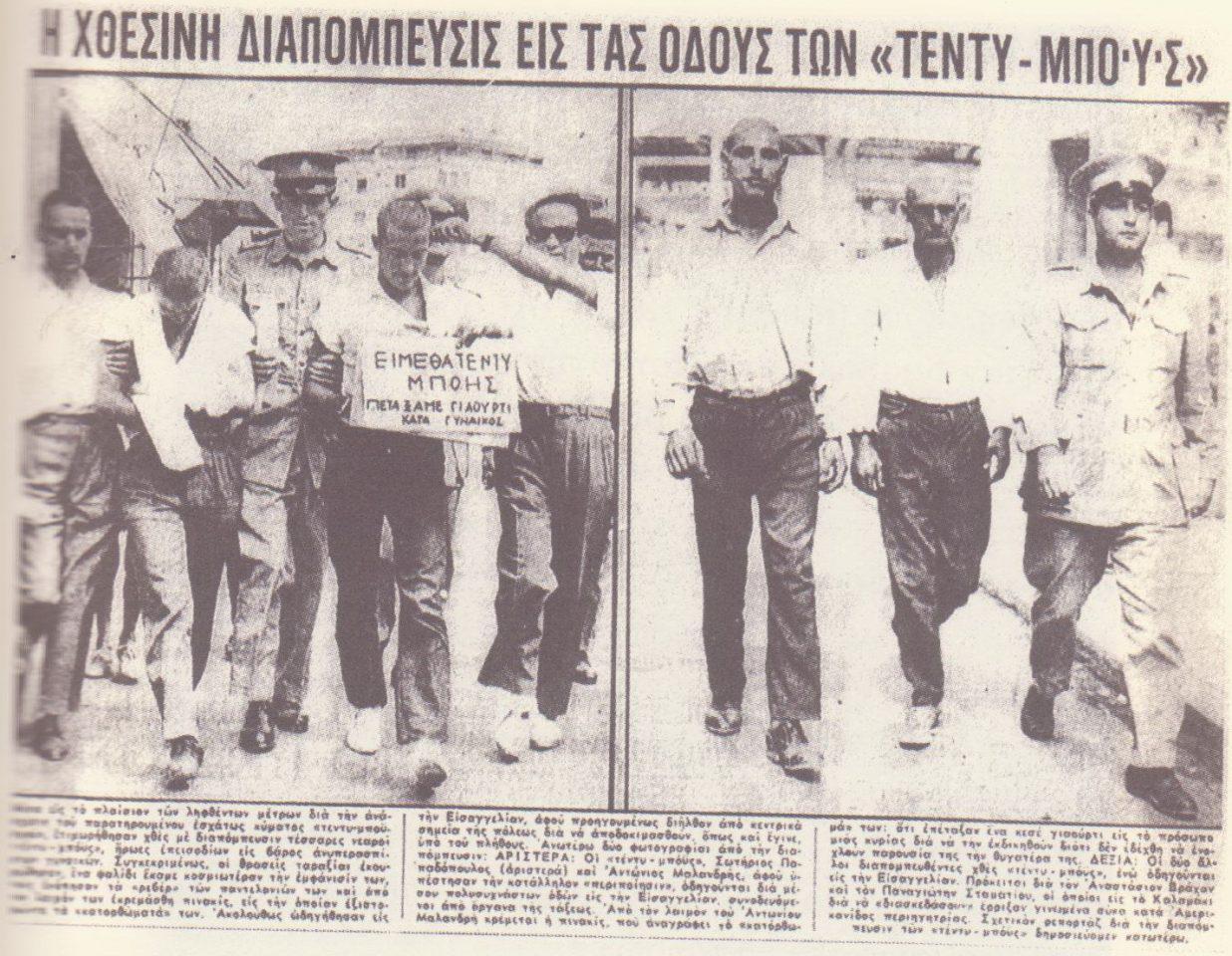 «Αυτό το θέαμα αντίκρισαν οι Αθηναίοι εις κεντρικούς δρόμους χθες την πρωΐαν. Με την προστατευτικήν συνοδείαν αστυνομικών οργάνων δια ν’ αποτραπή η κακοποίησις των από τους κατηγανακτημένους διαβάτας, τα αντιπαθητικά αυτά παλιόπαιδα, με αποτυπωμένην εις τα πρόσωπά των, μίαν κυνικήν θρασύτητα, οδηγούνται εις την Εισαγγελίαν, αφού εκουρεύθησαν με ψιλήν μηχανήν. Το ένα εκ των μελών της συλληφθείσης δυάδος φέρει αναρτημένην εις το στήθος του την ατιμωτικήν… ταυτότητα αμφοτέρων…», έγραφε το σχετικό δημοσίευμα της εποχής.