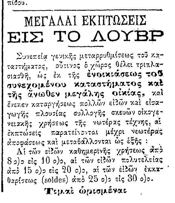 Ο πρώτος που παίρνει αυτή τη γενναία πρωτοβουλία είναι κάποιος έμπορος της Ερμαϊκής οδού, όπως ονομάζεται τότε η οδός Ερμού. Λέμε γενναία, γιατί η κίνηση αυτή αντιμετωπίζεται με καχυποψία από τους πελάτες του, που θεωρούν για να μειώνει ένα κατάστημα, μόνο του, τα πανάκριβα εμπορεύματά του, σημαίνει ότι τα τελευταία δεν είναι καλά… “Λύση” στο αιφνίδιο πρόβλημα του εμπόρου που βλέπει να διακινδυνεύεται η φήμη του, δίνει η παρουσία στο μαγαζί δύο επιφανών αθηναίων της εποχής, των Γεώργιου Φορέστη και Στέφανου Μενάνδρου, που σπεύδουν να επωφεληθούν των εκπτώσεων. “Το τοιούτον είθισται και εις στας Ευρώπας” απαντούν σε όσους ρωτούν γιατί ψώνισαν. Μικρή η πρωτεύουσα και με την ίδια ευκολία που μεταδίδονται οι αρνητικές ειδήσεις, το ίδιο γρήγορα μεταφέρονται και οι θετικές, με αποτέλεσμα σιγά-σιγά να “ξεθαρρέψουν” αρχικά οι πρώτοι πελάτες και εν συνεχεία ακολουθούν οι έμποροι στα δικά τους μαγαζιά.