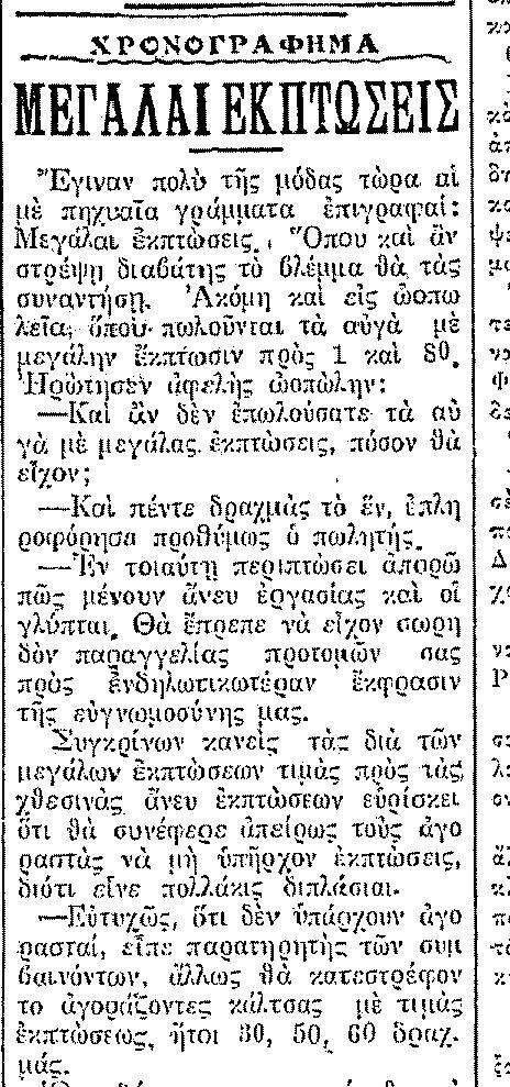 Χρονικογράφος του 19ου αιώνα περιγράφει πανικό τύπου Black Friday που επικρατεί σε καπελάδικο της πρωτεύουσας όταν το τελευταίο προσφέρει σε μισή τιμή καλοκαιρινά καπέλα :“Το τι έγινε με το αναπάντεχον τούτο ξεπούλημα είναι άνευ προηγουμένου, και δεν δύναται να περιγραφεί από τον πτωχικόν μου κάλαμον. Άπαντες οι νεαροί δανδήδες της πρωτευούσης, αλλά και οι μεσούντες και οι γέροντες έσπευδον εις το κατάστημα δια να ψωνίσουν εις την μισήν τιμήν τα καλοκαιρινά καπέλα των τα οποία θα ετοποθέτουν εις την κεφαλήν των μετά από πέντε ή έξη μήνας το λιγότερον”.
