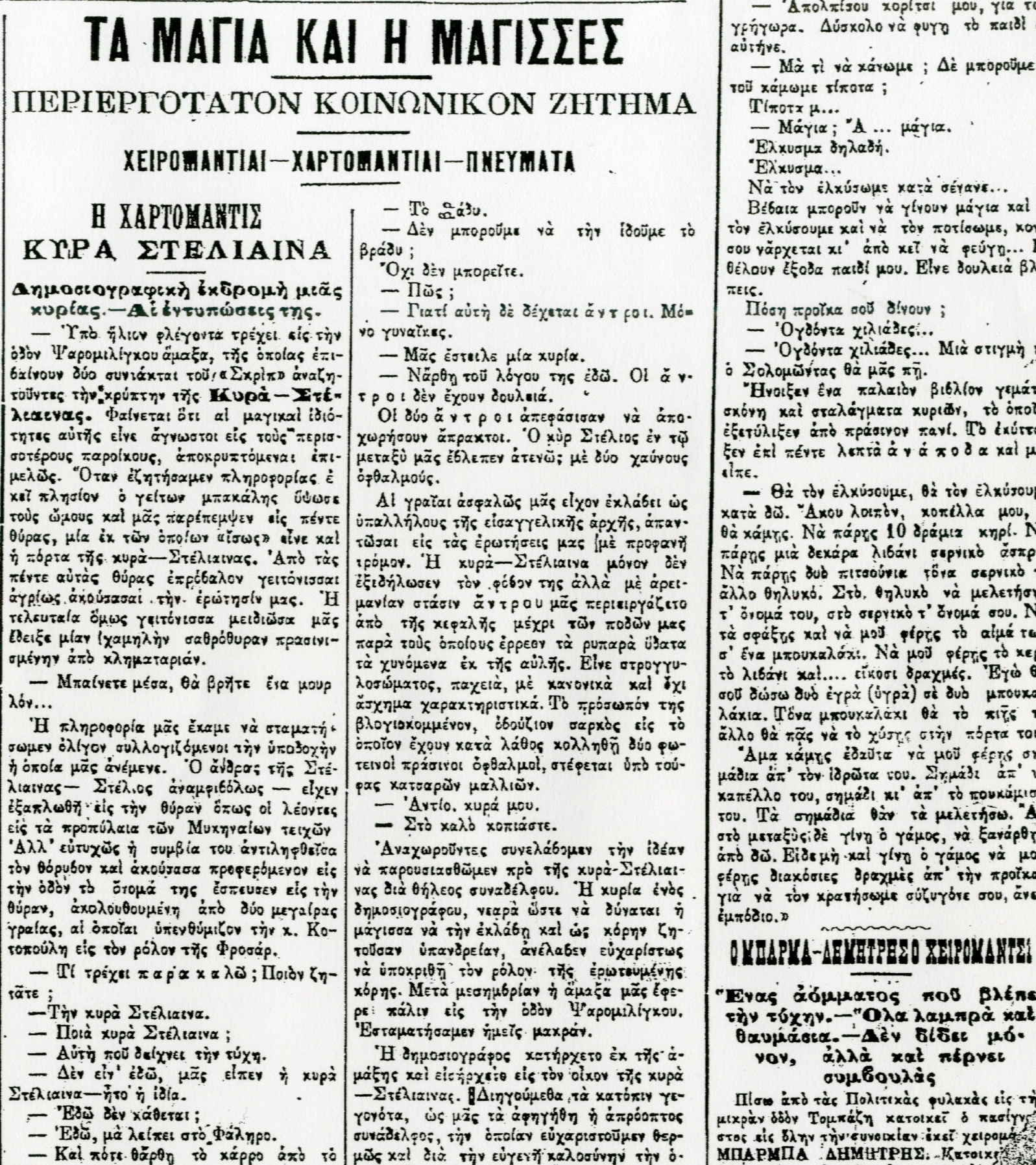 Εν συνεχεία κοιτά ερευνητικά την πελάτισσα και ξεκινά τα…θαύματα, όπως περιγράφει ρεπορτάζ άνδρα σε εφημερίδα του 1901 :¨Επήρε την τράπουλαν, την ανακάτωσεν και ήρχισε να ρίχνει τα χαρτιά σταυροειδώς. Εις την μέση έβαλε τον άσσο σπαθί. –Ο άσσος σπαθί είναι το στεφάνι, μου είπε, και ήρχισε να ψιθυρίζει ενώ έρριπτε τα χαρτιά. –Αν έχει καλό σκοπό το στεφάνι όρθιο και στο κεφάλι της. Αν δεν έχει σκοπό, το στεφάνι διπλανό και στα πόδια της. Ο γάμος αν αργεί Ρήγας εμποδάτος στη μέση. Ο γάμος αν έφτασε φτασμένο το επτά καρό. Γιώργος στην Ελεονόρα, Ελεονόρα στο Γιώργο. Ένα, δύο, τρία, τέσσερα, πέντε. Έριξε τα χαρτιά τρεις φορές σταυροειδώς με πολλούς ακατάληπτους ψιθυρισμούς”.