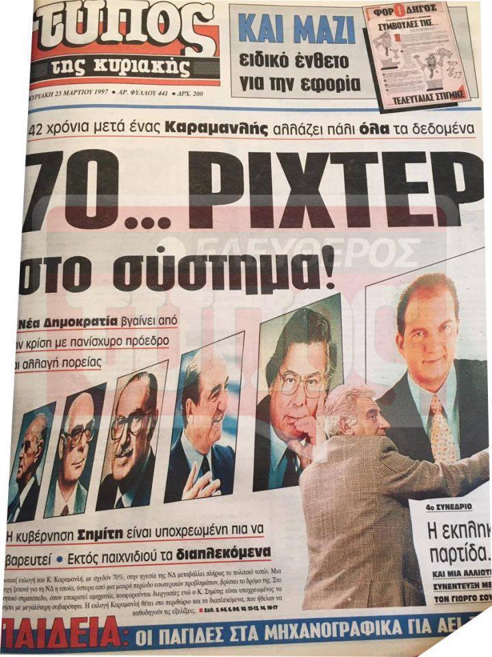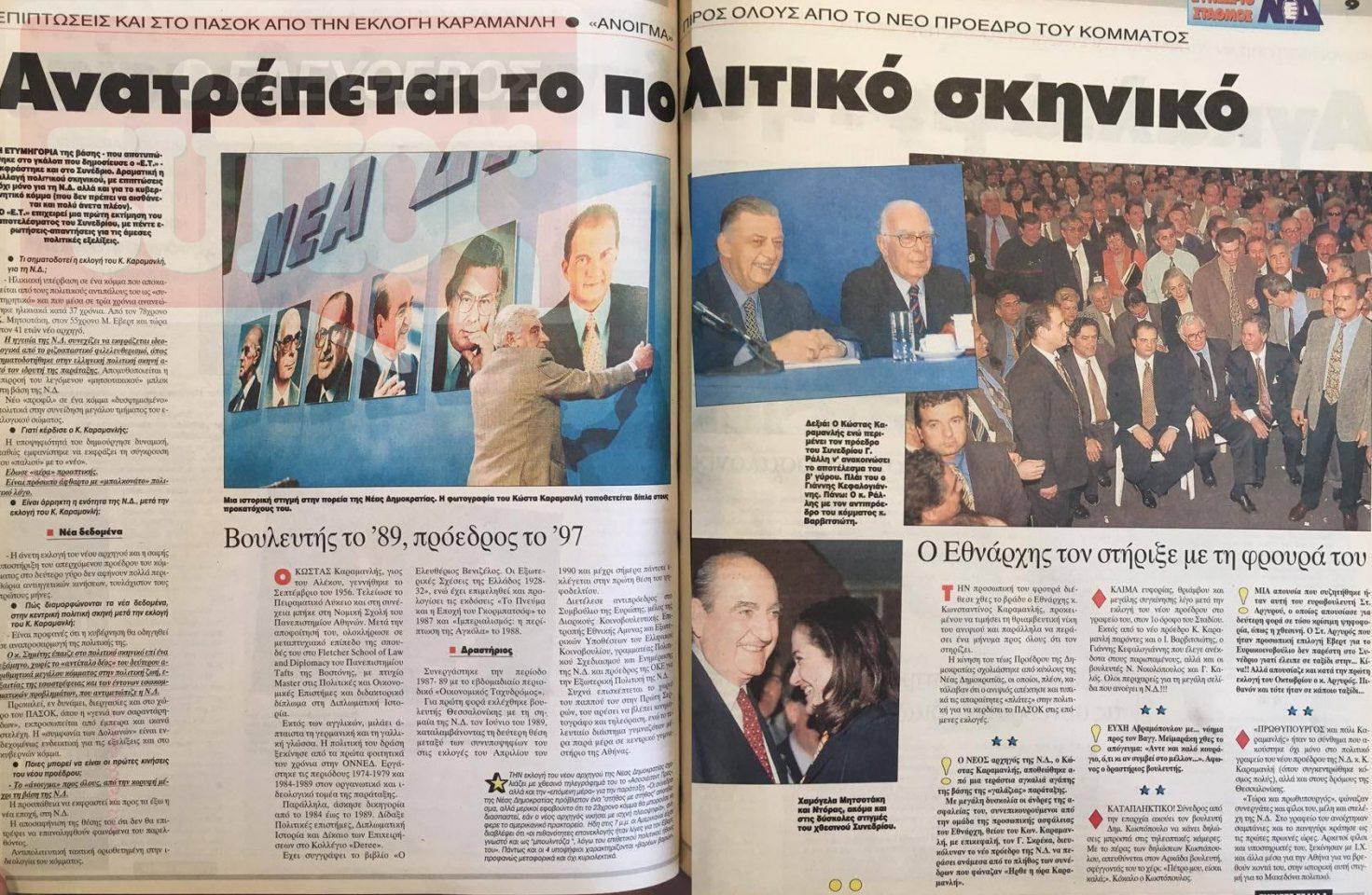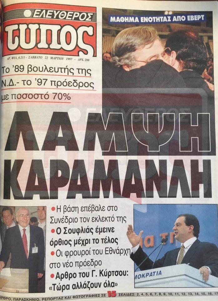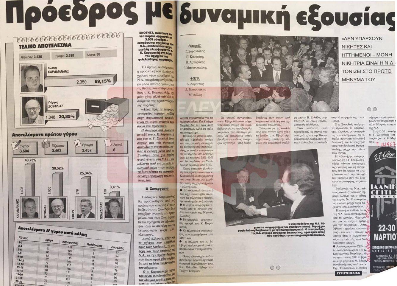 Το EleftherosTypos.gr, η ηλεκτρονική έκδοση του Ελεύθερου Τύπου, είναι εδώ για να μεταφέρει το κλίμα της εποχής αξιοποιώντας το αρχείο της εφημερίδας μας. 3.604 σύνεδροι, εκπρόσωποι της βάσης της Νέας Δημοκρατίας, ανέδειξαν πρόεδρο του κόμματος τον 41 ετών τότε, Κώστα Καραμανλή. Η εκλογική διαδικασία –που γινόταν για πρώτη φορά στην ιστορία της ΝΔ- ήταν ωστόσο έντονη και φυσικά παρασκηνιακή.