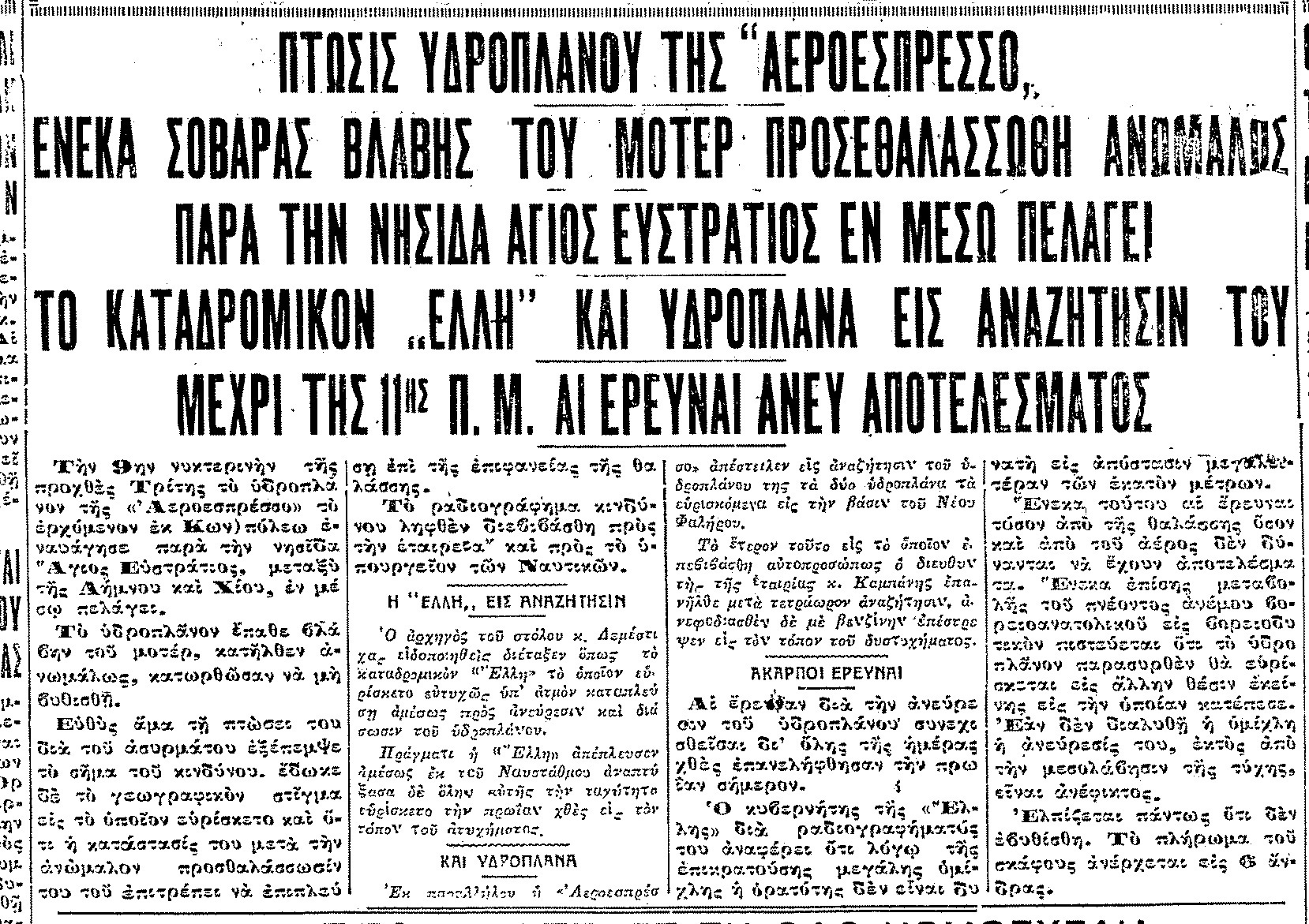 Αντίστοιχη με την παραπάνω, αλλά με λιγότερο μυστήριο, είναι η θαλάσσια τραγωδία που εξελίσσεται δώδεκα χρόνια μετά, το 1929. Όσο κι αν φαίνεται παράξενο -αφού βρισκόμαστε στα πρώιμα χρόνια της αεροπλοΐας- αλλά τότε υπάρχουν στη χώρα υδροπλάνα που εκτελούν κάποιες εναέριες μεταφορές, ακόμα και στο εξωτερικό. Πάλι ανήμερα Χριστουγέννων, το υδροπλάνο της εταιρίας «Αεροεσπρέσο» που εκτελεί την πτήση Κωνσταντινούπολη- Αθήνα εκπέμπει σήμα κινδύνου και τελικά ναυαγεί κοντά στο νησί του Άι Στράτη. Οι έρευνες για την εύρεση του υδροπλάνου και του εξαμελούς πληρώματος στις οποίες συμμετέχουν το καταδρομικό «Έλλη», δυο ιταλικά αντιτορπιλικά που βρίσκονται στην περιοχή και άλλα υδροπλάνα, αποβαίνουν άκαρπες, και σταματούν μετά από λίγες ημέρες χωρίς να βρεθούν ποτέ, ούτε τα συντρίμμια του ούτε οι σωροί του πληρώματος.
