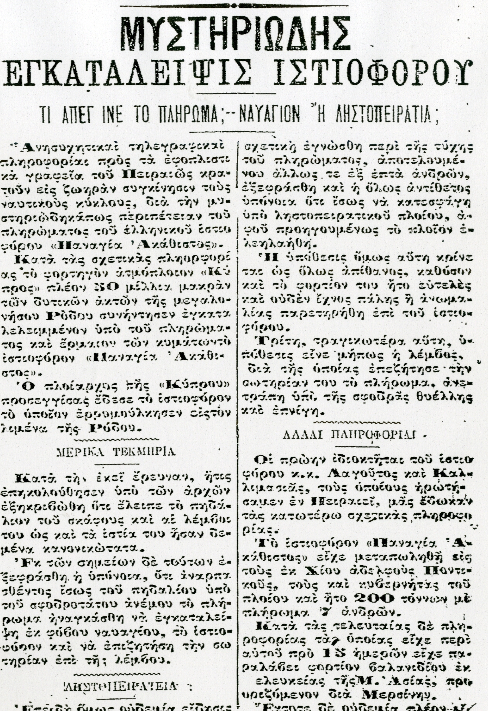 Είναι ανήμερα Χριστουγέννων του 1913, όταν το φορτηγό ατμόπλοιο “Κύπρος” συναντά να πλέει ακυβέρνητο το ιστιοφόρο “Παναγία Ακάθιστος”, τριάντα μίλια από τις δυτικές ακτές της Ρόδου. Όταν το πλήρωμα του ατμόπλοιου ανεβαίνει στο ιστιοφόρο διαπιστώνει ότι απουσιάζει το επταμελές πλήρωμα του καθώς και το πηδάλιο. Οι πρώτες πληροφορίες μιλούν για πειρατεία, κάτι όμως στην πορεία κρίνεται ως απίθανο, αφού το φορτίο είναι ευτελές, ενώ δε βρίσκεται στο πλοίο κανένα ίχνος πάλης, κλοπής, ή φθοράς. Ακόμα και η υπόθεση πνιγμού του πληρώματος συγκεντρώνει ελάχιστες πιθανότητες, αφού το ιστιοφόρο διατηρεί ακέραιες τις σωστικές του λέμβους με τις οποίες θα επιχειρούσε να διαφύγει το πλήρωμα σε περίπτωση θαλασσοταραχής. Οι έρευνες για την ανεύρεση του πληρώματος συνεχίζονται για αρκετές ημέρες, αλλά αποβαίνουν άκαρπες αυξάνοντας έτσι το μυστήριο για το τι συνέβη.