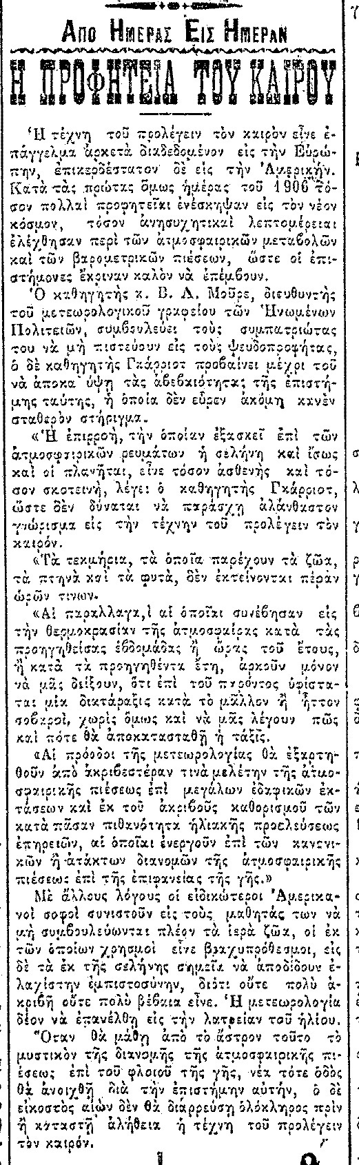 Παράλληλα, η λαϊκή πείρα στην εναλλαγή και ποικιλία των μετεωρολογικών φαινομένων, οδηγεί σε κάποιες γενικεύσεις οι οποίες περνούν από γενιά σε γενιά με σχετικά γνωμικά και παροιμίες. Ο λαός διαβάζει “τα σημάδια” που τα συνδέει με φυσικά φαινόμενα. Στη λαϊκή μετεωρολογία υπάγονται τα περίφημα μερομήνια, μηναλλάγια ή καταμηνάτα, όπου στις πρώτες δώδεκα, συνήθως, μέρες του Αυγούστου παρατηρώντας καιρικά σημάδια, φαινόμενα και γενικότερα την καιρική κατάσταση, προβλέπει τον καιρό όλου του έτους, θεώρηση που απορρίπτεται από την μετεωρολογική κοινότητα.