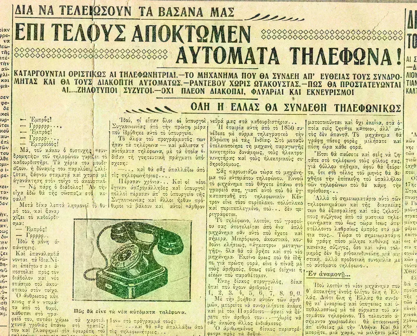 Ουσιαστικά τα θεμέλια ανάπτυξης του τηλεφώνου στη χώρα μπαίνουν τη δεκαετία του ‘30. Αρχικά η ΑΕΤΕ (Ανώνυμος Ελληνική Τηλεφωνική Εταιρία) δημιουργεί δίκτυο σε όλη τη επικράτεια, αυξάνοντας κατακόρυφα τις τηλεφωνικές συνδέσεις σε 57 χιλιάδες. Η χώρα συνδέεται τηλεφωνικά αρχικά με Βουλγαρία, Γιουγκοσλαβία και το 1934 με όλη την Ευρώπη, τα «καβουρντιστήρια» αντικαθίστανται από συσκευές με καντράν, τα τηλεφωνικά κέντρα από αυτόματα τηλέφωνα, ενώ εκδίδεται ο πρώτος τηλεφωνικός κατάλογος.