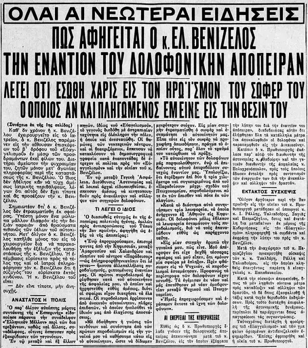 Με εξουδετερωμένο το ένα αυτοκίνητο τα πυρά πλέον στρέφονται αποκλειστικά σε αυτό του Βενιζέλου. Η προεδρική Πακάρ δέχεται καταιγισμό πυροβολισμών με τον Βενιζέλο, έχοντας την εμπειρία της προηγούμενη απόπειρας, να αντιδρά άμεσα :ρίχνει κάτω την σύζυγο του Έλενα και εν συνεχεία πέφτει πάνω της. Ας δούμε τι αναφέρει ο ίδιος για τιςδραματικές εκείνες στιγμές :“Οι πυροβολισμοί ερρίπτοντο από ανοιχτόν αυτοκίνητον, πλήρες επιβατών, το οποίον ηκολούθει το ιδικόν μας από ελαχίστης αποστάσεως. Με εβοήθησε η γνώση των κινδύνων και συνέστησα από των πρώτων πυροβολισμών εις την γυναίκαν μου να καθίσουμε κάτω εις το αυτοκίνητον, ώστε να δίνωμεν μικρότερον στόχον. Εις μιαν στιγμήν ετραυματίσθει ο σωφέρ μου και εσταμάτησε το αυτοκίνητόν μας”.