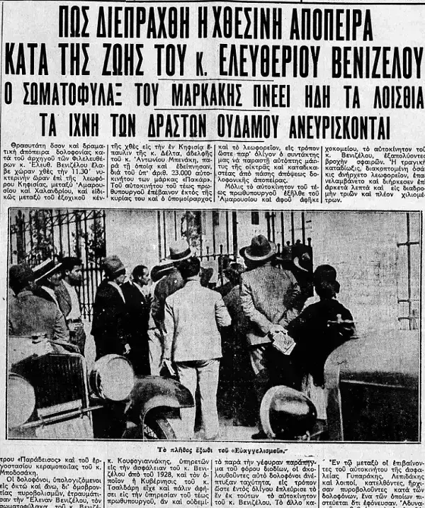 Φεύγοντας από εκεί λίγο πριν της 11 τα μεσάνυχτα οι Ελευθέριος και Έλενα Βενιζέλου επιβιβάζονται σε ένα αυτοκίνητο Πακάρ με οδηγό τον Ιωάννη Νικολάου και μαζί τον υπομοίραρχο της προσωπικής τους ασφαλείας Μιχάλη Κουφογιαννάκη. Πίσω ακολουθεί μια Λίνκολν- Φορντ της ασφάλειάς του, με οδηγό τον Φιλ. Μιχαλόπουλο και τους Ανδρέα Γυπαράκη, επικεφαλής της προσωπικής ασφάλειας του Βενιζέλου, Ανδρέα Λεμπιδάκη και Ιωάννη Μαρκάκη.