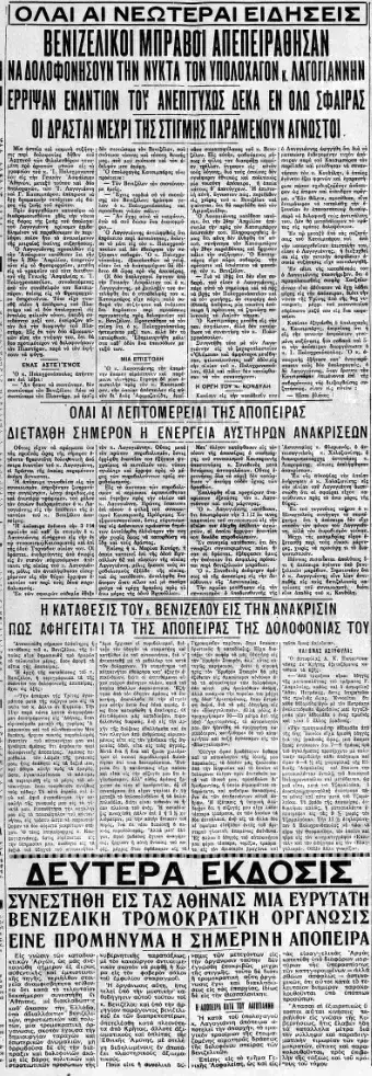 Η τετραήμερη συζήτηση στην κατάμεστη αίθουσα του κοινοβουλίου είναι τόσο επεισοδιακή, που ο Βενιζέλος δεν ολοκληρώνει δύο φορές την ομιλία του. Την πρώτη κατεβαίνει θυμωμένος από την έδρα μη αντέχοντας το πανδαιμόνιο, και τη δεύτερη μια αναφορά στον Πλαστήρα αρκεί ώστε ο πρωθυπουργός Τσαλδάρης φοβούμενος κλιμάκωση των επεισοδίων κηρύττει λήξασα τη συνεδρίαση. Είναι όμως τέτοια η όξυνση των πολιτικών παθών που τίποτα δεν έχει τελειώσει…