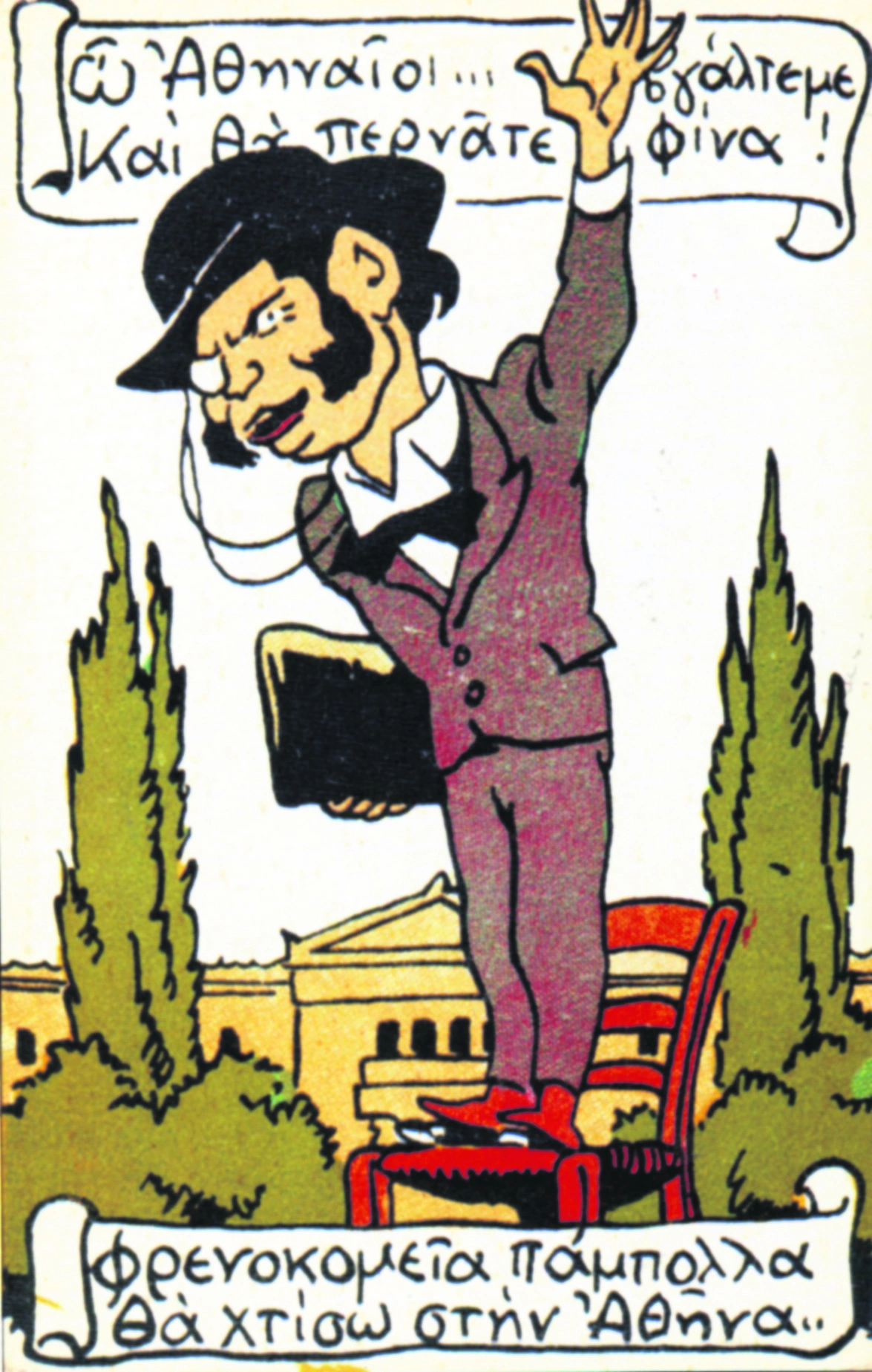 Εκδίδει, με τη βοήθεια ισχυρών χρηματοδοτών, εβδομαδιαία σατιρική εφημερίδα, η οποία, για μια περίοδο, σημειώνει μεγάλες κυκλοφορίες. Το ενδιαφέρον του για την πολιτική τον οδηγεί στη δημιουργία σειράς κομμάτων, που έχουν ως κοινά χαρακτηριστικά τους χιλιάδες υποστηρικτές και τους ελάχιστους ψηφοφόρους. «Αναμορφωτικό Κόμμα», «Κόμμα των Κυανοχιτώνων» και, τέλος, «Κόμμα των Κυανολεύκων». Ξεχωρίζει για τους συνεχείς δημόσιους λόγους του, στους οποίους μιλά υπέρ του ελεύθερου έρωτα, κατακεραυνώνει τους κυβερνώντες, σχηματίζει κυβερνήσεις και μοιράζει αφειδώς υπουργικά χαρτοφυλάκια έναντι δύο δραχμών. Το 1928 σχηματίζει «κυβέρνηση», ενώ η ορκωμοσία των «υπουργών», που φορούν όλοι ψηλά καπέλα, γίνεται σε αθηναϊκή εξοχή. Στο προεκλογικό του πρόγραμμα αναφέρει ότι «Πρώτα απ’ όλα θα βγάλω τα συρματοπλέγματα από το Δαφνί και θα τα βάλω στα ελληνικά σύνορα. Γενικά, δεν επιτρέπεται να υπάρχουν Ελληνες διαβιούντες εκτός συρματοπλέγματος».