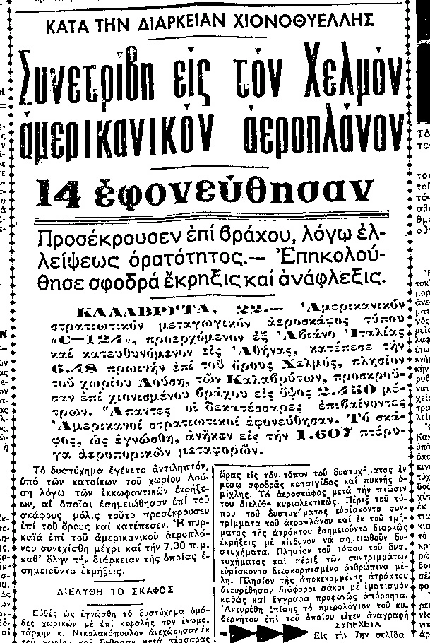 Η Αμερικανική πρεσβεία στην Ελλάδα κινητοποιώντας όλο το ανθρώπινο και τεχνολογικό δυναμικό της φτάνει μετά από πέντε ώρες στην περιοχή, ενώ ακολουθούν γιατροί, νοσοκόμοι και διασώστες προς, μάταιη, αναζήτηση τραυματισμένων επιζώντων. Οι έρευνες διεξάγονται σε εξαιρετικά αντίξοες συνθήκες :ομίχλη, ραγδαίες βροχοπτώσεις, χιονιά και θερμοκρασίες δέκα βαθμών υπό το μηδέν και σε δύσβατο σημείο. Το μόνο που καταφέρνουν είναι να βρουν κομμάτια των θυμάτων που αντιστοιχούν σε πέντε πρόσωπα, ενώ οι υπόλοιποι θεωρείται ότι απανθρακώθηκαν. Κάποιες φήμες λένε ότι ανάμεσα στους σωρούς βρίσκεται η σύζυγος ανώτατου Αμερικανού στρατιωτικού που υπηρετεί στην Ελλάδα.