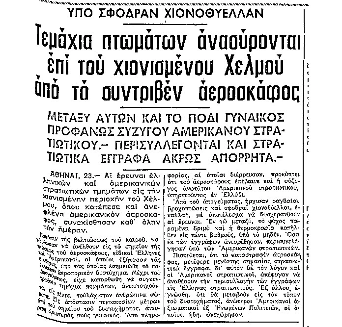 Εκτός των θυμάτων στο αεροσκάφος βρίσκονται στρατιωτικοί κώδικες, σημαντικά έγγραφα ΝΑΤΟικού ενδιαφέροντος, επίσημη και ανεπίσημη αλληλογραφία για αεροπορικές μονάδες της Μέσης Ανατολής και βάσεις του ΝΑΤΟ, κάτι που έχει ως αποτέλεσμα την ευθύνη των ερευνών να αναλάβουν οι Αμερικανοί. Οι εφημερίδες της εποχής σημειώνουν για τα έγγραφα ότι “μπορούσαν να πέσουν εις χείρας των πρακτόρων του εχθρού” και συνεχίζουν :“Πιστεύεται ότι το κατεστραφέν αεροσκάφος μετέφερε μεγίστης σημασίας στρατιωτικά έγγραφα, δι αυτόν τον λόγον οι Αμερικανοί στρατιωτικοί απέφυγαν να αναθέσουν την περισυλλογήν των εγγράφων εις Έλληνας στρατιωτικούς. Και το τελευταίον χαρτί που οποίον μπορούσε να πέσει εις χείρας των πρακτόρων του εχθρού είχε μεγάλην σημασίαν ελπίζεται δε ότι τοιούτως κίνδυνος απεφεύχθη”.