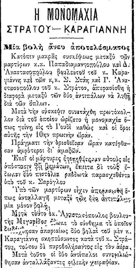 Πρώτος σημαδεύει ο Καραγιάννης αλλά αποτυγχάνει να πετύχει τον Στράτο, ενώ ο δεύτερος, πιο μεγαλόψυχος, πυροβολεί στον αέρα. Η σεμνή τελετή τελειώνει σύντομα με τους δύο πολιτικούς να δίνουν τα χέρια και, ίσως, να ανταλλάσσουν χριστουγεννιάτικες ευχές… Όμως τα παράδοξα της ιστορίας δεν τελειώνουν εδώ. Είκοσι χρόνια μετά ο Νικόλαος Στράτος γίνεται για έξι ημέρες πρωθυπουργός στη τελευταία περίοδο της Μικρασιατικής εκστρατείας. Είναι κατηγορούμενος στη περίφημη “δίκη των 6” όπου το στρατοδικείο τον κρίνει ένοχο για εσχάτη προδοσία και τον καταδικάζει σε θάνατο. Έτσι, ο Νικόλαος Στράτος μπορεί να γλιτώνει από τα χριστουγεννιάτικα πυρά του Καραγιάννη, αλλά όχι από αυτά του εκτελεστικού αποσπάσματος στον ίδιο χώρο είκοσι χρόνια μετά…