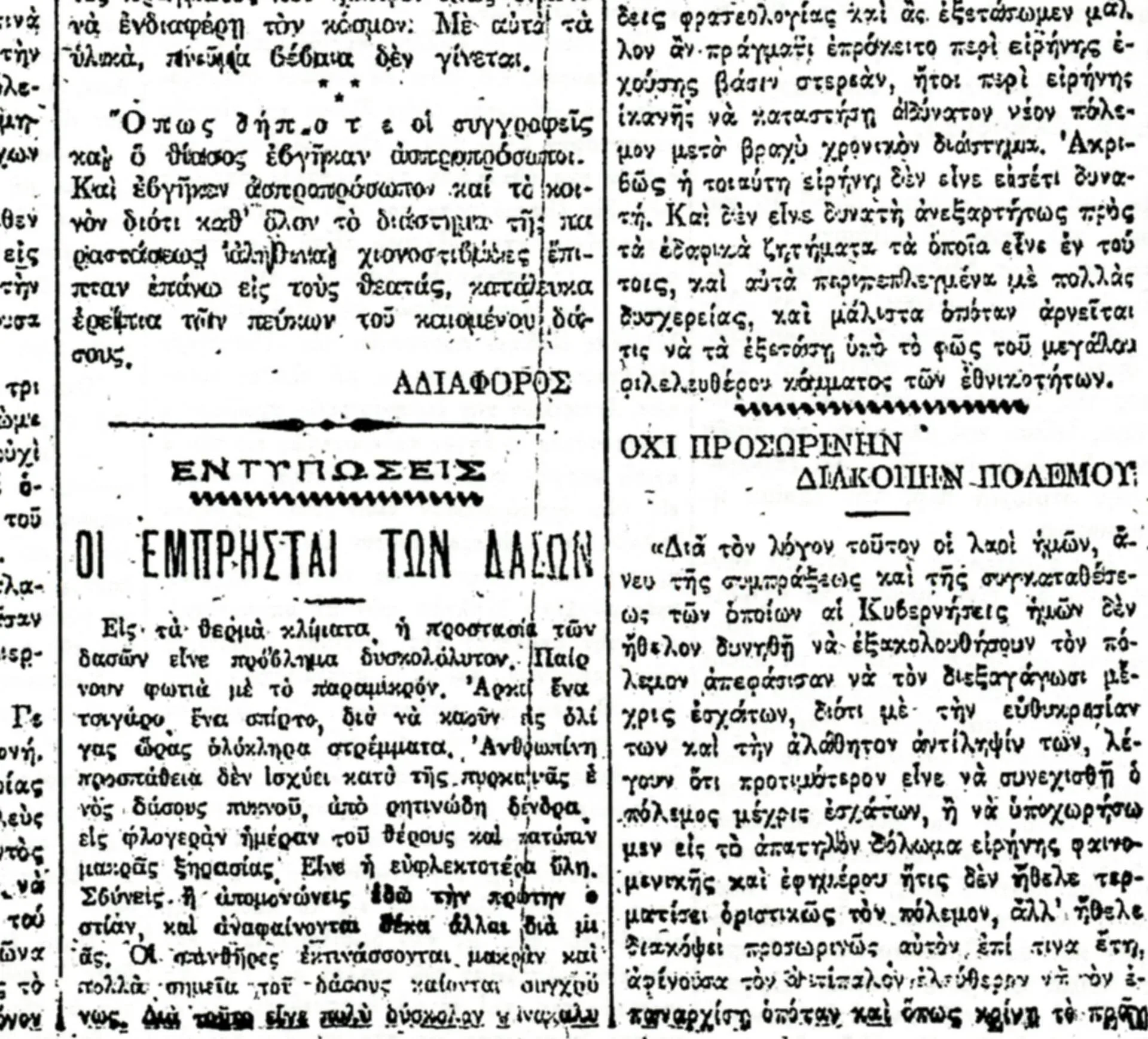 Όμως η σταδιακή αστικοποίηση που μετατρέπει αυτόματα τις παραπλήσιες με τις πόλεις δασικές περιοχές σε ελκυστικά οικόπεδα, έχουν ως αποτέλεσμα η λέξη “εμπρηστής” να εμφανίζεται συχνότερα στο λεξιλόγιο των εφημερίδων :“Τα δάση της Ελλάδος, απ άκρου εις άκρον καίονται. Ουδέν προληπτικόν μέτρον, ουδεμία επίβλεψις, καμία φροντίς δια τα δάση. Αφήνονται έρμαια της κακούργου ασυνειδησίας και της εγκληματικότητος των εμπρηστών. Και εις το τέλος μας λέγουν «το πυρ ήτο τυχαίον» και αναπαύουν την συνειδησίν των”.