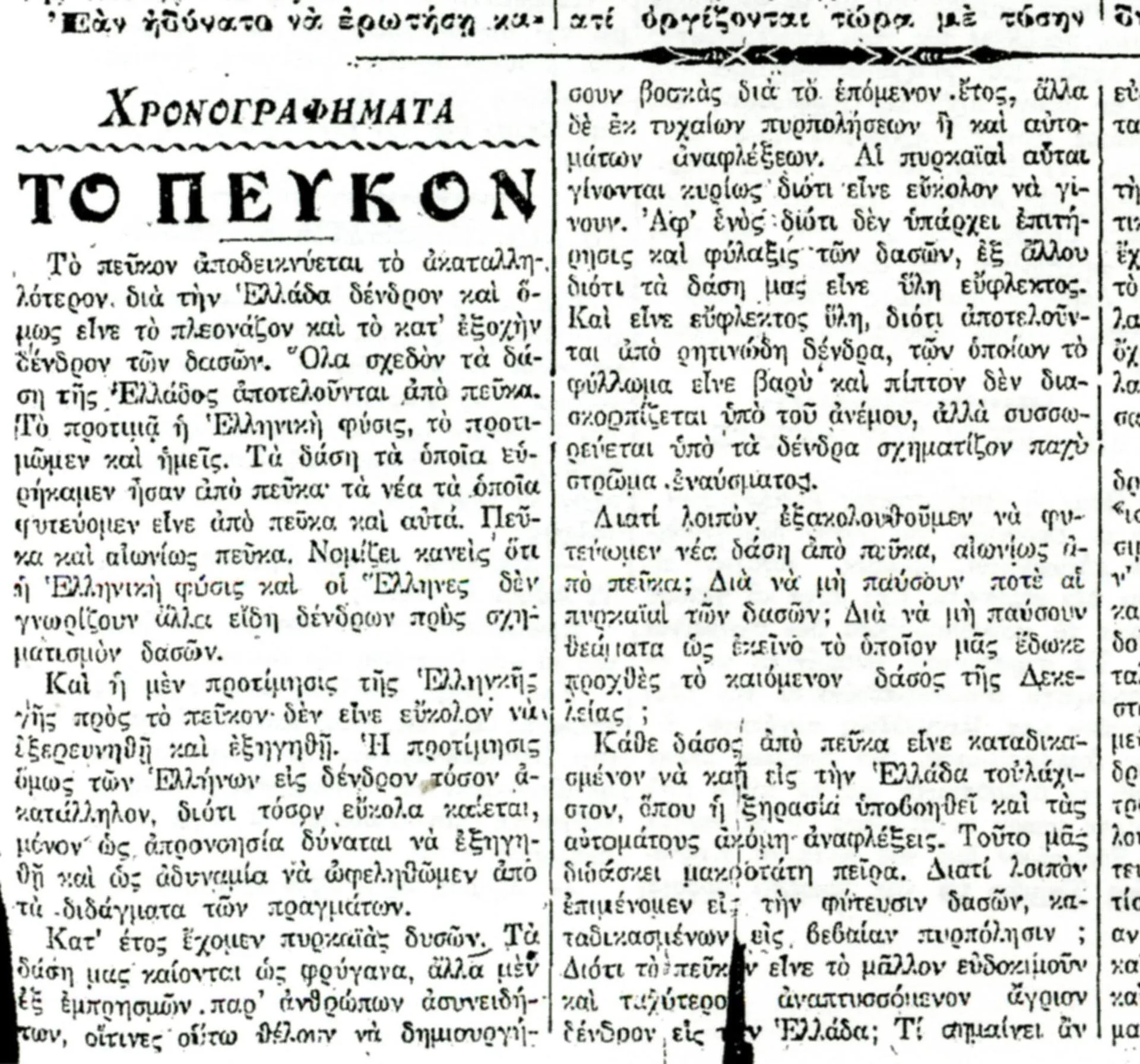 Η αναζήτηση ενόχων για τις αυξανόμενες δασικές πυρκαγιές οδηγεί τις εφημερίδες στα… πεύκα. Σειρά δημοσιευμάτων την δεκαετία του 1910, αναφέρονται στην επικινδυνότητα του πεύκου σε περίπτωση φωτιάς :“Κατ’ έτος έχομεν πυρκαγιάς δασών. Τα δάση καίωνται ως φρύγανα, άλλα μεν εξ εμπρησμών, παρ’ ανθρώπων ασυνειδήτων, οίτινες ούτω θέλουν να δημιουργήσουν βοσκάς δια το επόμενων έτος, άλλα δε εκ τυχαίων πυρπολήσεων η και αυτομάτων αναφλέξεων. Αι πυρκαιαί αύται γίνονται κυρίων διότι είναι εύκολον να γίνουν. Αφ’ ενός διότι δεν υπάρχει επιτήρησις και φύλαξης των δασών, εξ άλλου τα δάση μας είναι ύλη εύφλεκτος Διατί λοιπόν εξακολουθούμε να φυτεύουμε νέα δάση από πεύκα, αιωνίως από πεύκα; Δια να μην παύσουν ποτέ αι πυρκαιαί των δασών ;”.
