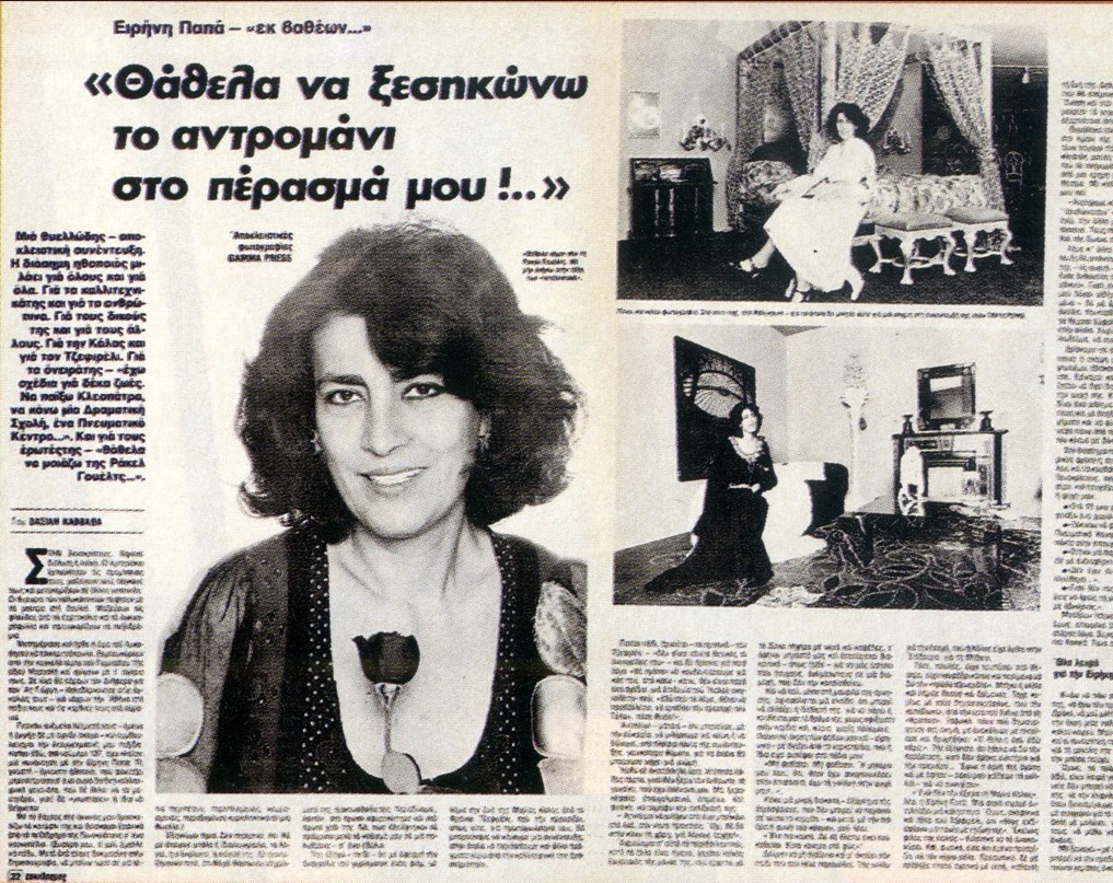 Ο ένας αιφνιδιασμός διαδέχεται τον άλλον και οι αναγνώστες του περιοδικού ανακαλύπτουν πως μπορεί πίσω από μια πραγματικά μεγάλη γυναίκα να υπάρχει αμεσότητα και ειλικρίνεια :“Μια άλλη φορά στο Λος Άντζελες χώρισα με έναν σπουδαίο ηθοποιό, ωραίο άνθρωπο και πασίγνωστο καλλιτέχνη γιατί μου έκανε ένα αστείο. Χοντρό αστείο. Ίσως να έψαχνα να φύγω. Όμως δεν θέλησα να τον ξαναδώ. Είχα μια περιπέτεια με έναν διπλωμάτη από τις αραβικές χώρες. Μου είπε μια μέρα :“Ζήτησα και έμαθα πως σε έχουν χαρακτηρίσει στα τεφτέρια τους οι διεθνείς τράπεζες πληροφοριών :Αναρχική αλλά όχι επικίνδυνη.