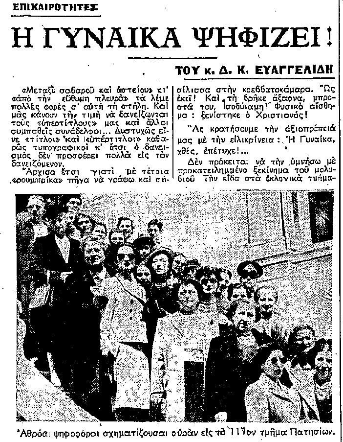 Σε κάθε περίπτωση όμως τα σχόλια για την πρώτη γυναικεία συμμετοχή στην εκλογική διαδικασία είναι αποθεωτικά :“Το ζωηρό ενδιαφέρον των δια τα δημόσια πράγματα και η ποιότης της ψήφους των, απέδειξαν ότι αι γυναίκες αποτελούν πολύτιμον εθνικόν παράγοντα”, με κάποιους να τονίζουν την ευθύνη που αναλαμβάνουν :“Έπειτα από αγώνες χρόνων και χρόνων, οι γυναίκες ψήφισαν προχθές για πρώτη φορά στην Ελλάδα. Και παίρνοντας το δικαίωμα της ψήφου απέδειξαν ότι είναι σε θέση να νοιώσουν όσο και οι άνδρες, και ίσως περισσότερο από αυτούς, ότι το να ψηφίσουν δεν είναι στην πραγματικότητα ένα δικαίωμα που τους δίνει η πολιτεία, αλλά ένα μεγάλο καθήκον που αναλαμβάνουν”.