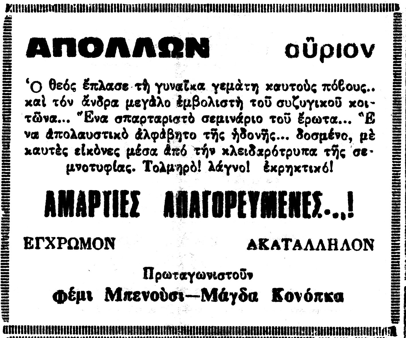 Χαρακτηριστικό της ενοχής που αντιμετωπίζουν οι πρωταγωνιστές αυτών των ελληνικών ταινιών είναι το παρακάτω ρεπορτάζ που δημοσιεύεται στις αρχές της δεκαετίας του ’70: «Πείτε μας την αλήθεια. Θα αφήνατε τα παιδιά σας να δουν τις ταινίες που έχετε γυρίσει; Σήμερα, αύριο, μετά πέντε – δέκα χρόνια;».