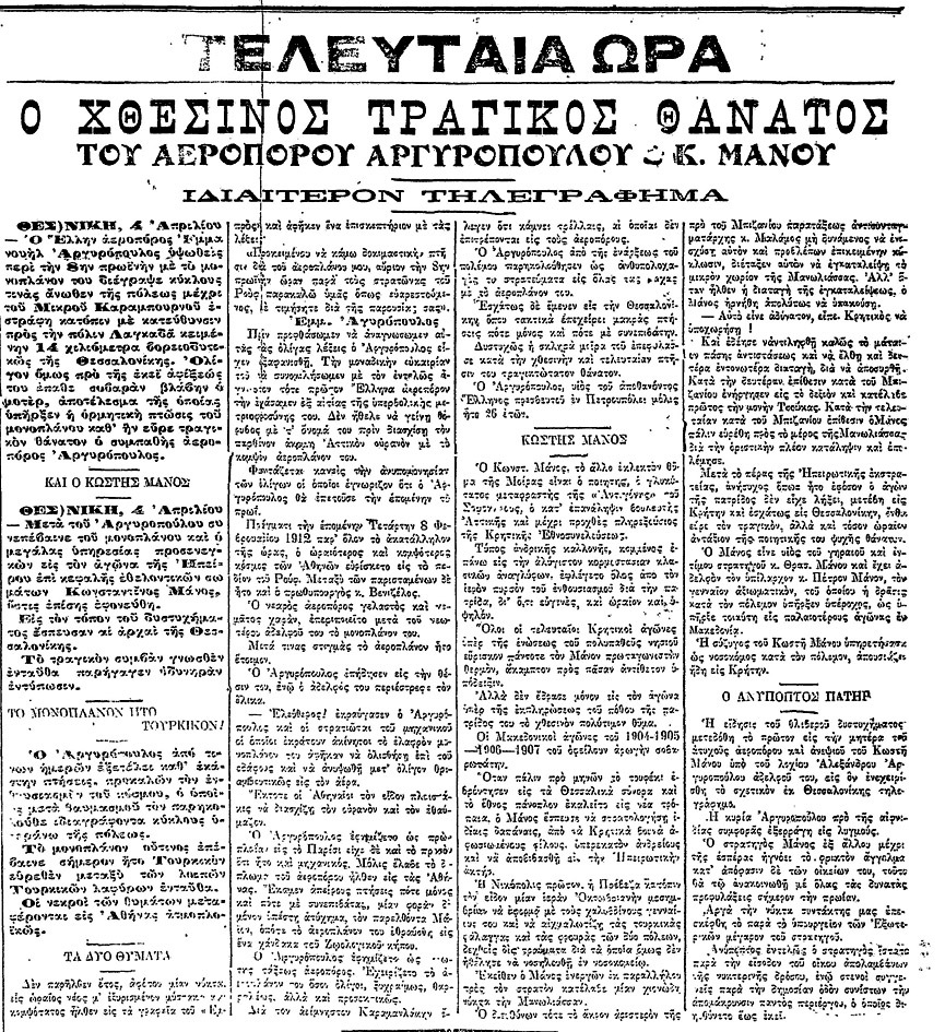 Εκείνη την ημέρα, ο Αργυρόπουλος απογειώνεται για μια συνηθισμένη πολεμική αποστολή, η οποία επρόκειτο να γίνει την προηγουμένη, αλλά αναβλήθηκε λόγω καιρού. Συνεπιβάτης του είναι ο Κωνσταντίνος Μάνος, λόγιος, πρώην βουλευτής Αττικής, και θείος της Ασπασίας Μάνου, συζύγου του μετέπειτα βασιλιά Αλέξανδρου. Στις αρχές των Βαλκανικών Πολέμων ο Μάνος έχει ηγηθεί αντάρτικων ομάδων και από τον Τύπο της εποχής χαρακτηρίζεται ως «εκπορθητής της Πρεβέζης».
