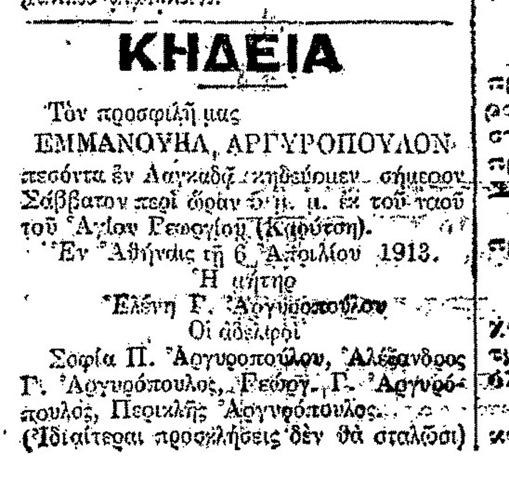 Η κηδεία του Αργυρόπουλου γίνεται στον Αγιο Γεώργιο Καρύτση, παρουσία σύσσωμου του υπουργικού συμβουλίου και του Βενιζέλου. Δίπλα στη σορό του νεκρού εκτίθεται η ακόμη απαστράπτουσα στολή του ανθυπολοχαγού του Μηχανικού. Τον επικήδειο εκφωνεί ο μόνιμος συνάδελφός του, αεροπόρος υπολοχαγός Μιχαήλ Μουτούσης. Ο Κωνσταντίνος Μάνος ήταν 44 ετών. Ο πρωτοπόρος της Ελληνικής Αεροπορίας Εμμανουήλ Αργυρόπουλος ήταν μόλις 24 ετών και η ένδοξη πορεία του στους αιθέρες, παρότι διαρκεί μόλις ένα χρόνο, είναι αρκετή για να τον γράψει η Ιστορία, αφού αποτελεί τον πρώτο άνθρωπο στον ελληνικό χώρο που μετά τον μυθικό Ικαρο πετά και του «καίγονται» τα φτερά…