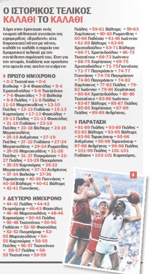 Χάρη στην έμπνευση ενός νεαρού αθλητικού συντάκτη της εφημερίδας «Βραδυνή» είχε δημοσιευτεί πόντο με πόντο, καλάθι το καλάθι η πορεία του δραματικού τελικού με την πεντάλεπτη παράτασή του. Ετσι για την ιστορία, διαβάστε και κρατήστε στο αρχείο σας εκείνο το κείμενο: