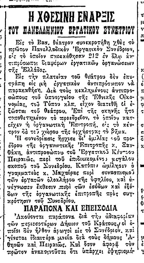 Το ιδρυτικό συνέδριο της ΓΣΕΕ κρατά οκτώ ημέρες και πραγματοποιείται σε Αθήνα και Πειραιά. Σε αυτό συμμετέχουν 44 σωματεία με 182 αντιπροσώπους περίπου 60.000 χιλιάδων εργαζομένων και διαθέτει όλο το πλαίσιο των επόμενων συνεδρίων: ένταση, διαφωνίες, αποχωρήσεις και ιδεολογικές διαμάχες. Σε αυτό συζητούνται αρκετά εργασιακά αιτήματα, όπως ασφάλιση όλων των εργαζομένων, ωράρια και αμοιβές, συνδικαλιστικές ελευθερίες, δικαιώματα εργαζόμενων γυναικών και ανηλίκων και ψήφιση θεσμικού πλαισίου.