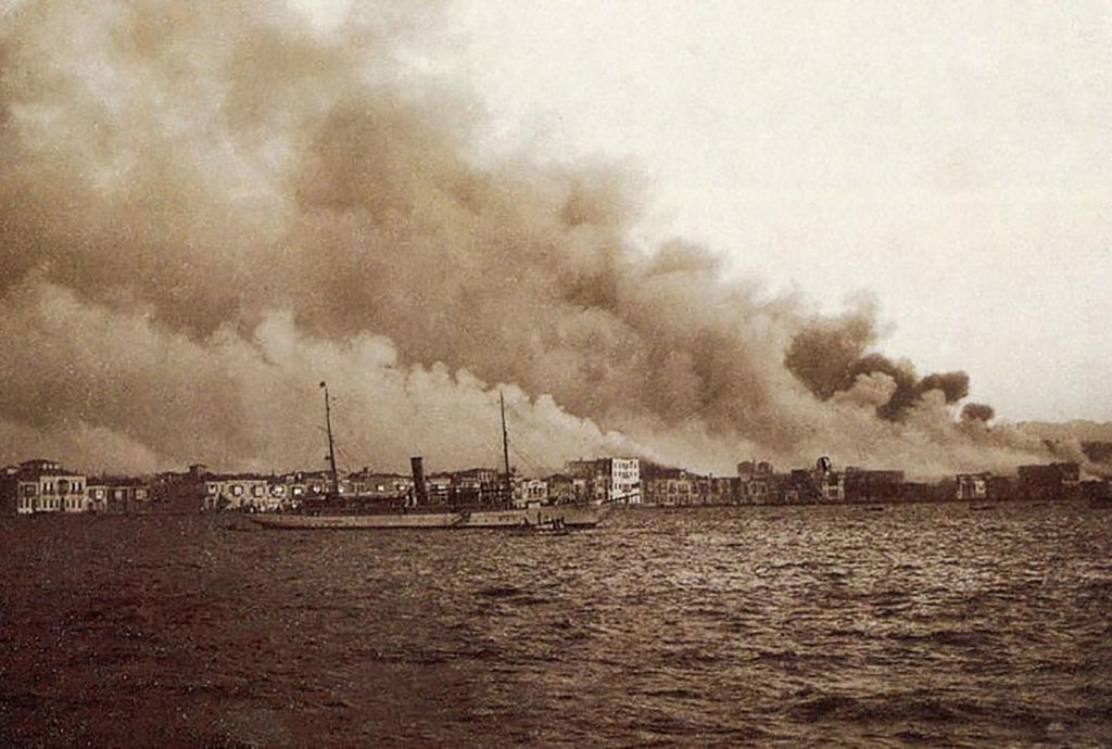 Την φρίκη ολοκληρώνει η πυρπόληση της πόλης, που οδηγεί τους αμάχους στην παραλία, οπού τους περιμένει το επόμενο μαρτύριο. Η κυκλοφορία μετά τις 19.00 απαγορεύεται και όσοι δεν επιστρέφουν στα φλεγόμενα σπίτια τους, θεωρούνται παραβάτες του στρατιωτικού νόμου και εκτελούνται επιτόπου. Ο Γάλλος ιστορικός Εντουάρ Ντριό αναφέρει :“Χιλιάδες από δυστυχείς υπάρξεις σωρευμένες κατά μήκος της προκυμαίας ρίχτηκαν στην θάλασσα. Σε μεγάλο μήκος του λιμανιού εκατοντάδες πτώματα είχαν γεμίσει την θάλασσα, ώστε να μπορεί κανείς να περπατήσει πάνω σ’ αυτά. Τους επιπλέοντες αποτελείωναν οι Τούρκοι με σπαθιά και ξύλα. Αναρίθμητες υπάρξεις, προπαντός γυναίκες, παιδιά και γέροντες εσφάγησαν μέσα σε αίσχιστες θηριωδίες”.