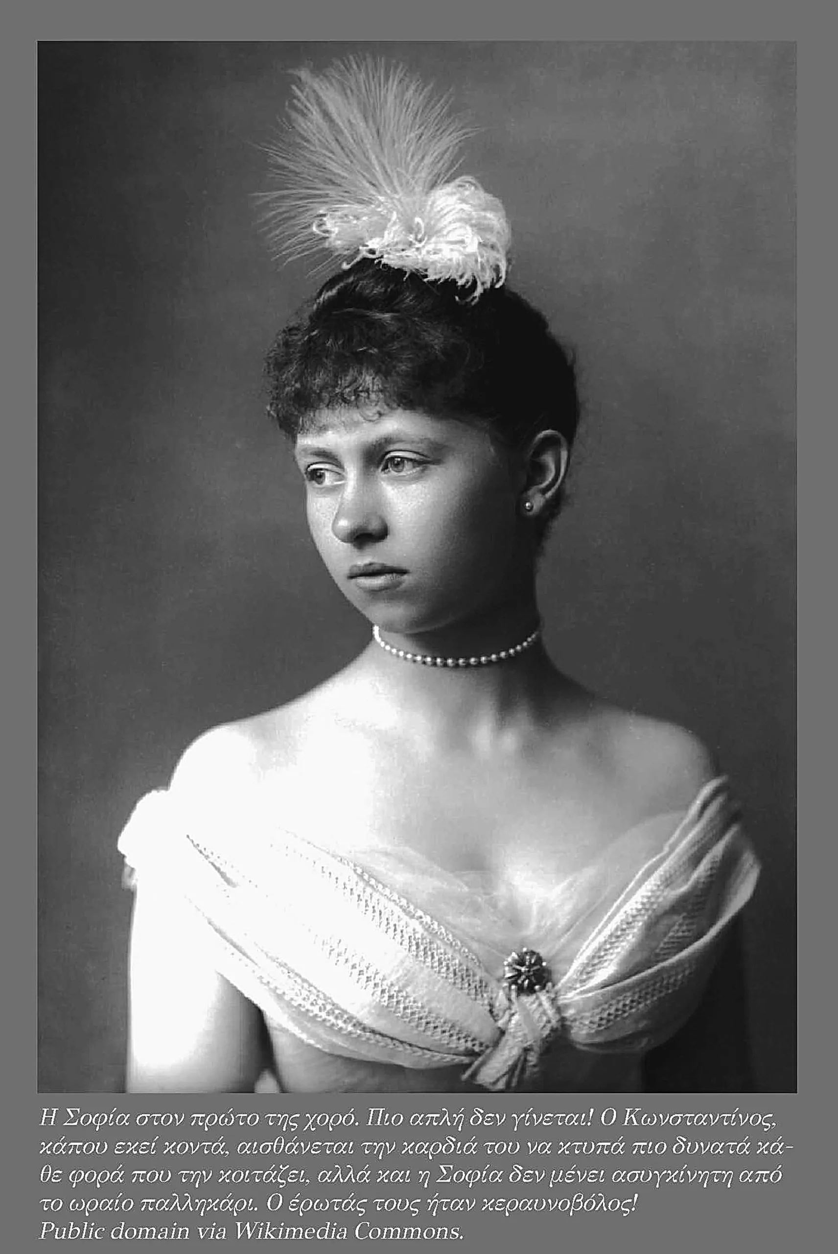 Στα 17 της χρόνια, στον Κωνσταντίνο βρήκε την αγάπη που ήταν κεραυνοβόλα και αμοιβαία και τον ακολούθησε στην Ελλάδα. Ασπάστηκε την Ορθοδοξία, αγάπησε την Ελλάδα, λάτρευε τα δάση και, σύμφωνα με τον συγγραφέα, «η Σοφία πήρε τίτλο βασίλισσας πριν γίνει βασίλισσα των Ελλήνων. Από το 1900 την ονόμαζαν η βασίλισσα του δάσους!».