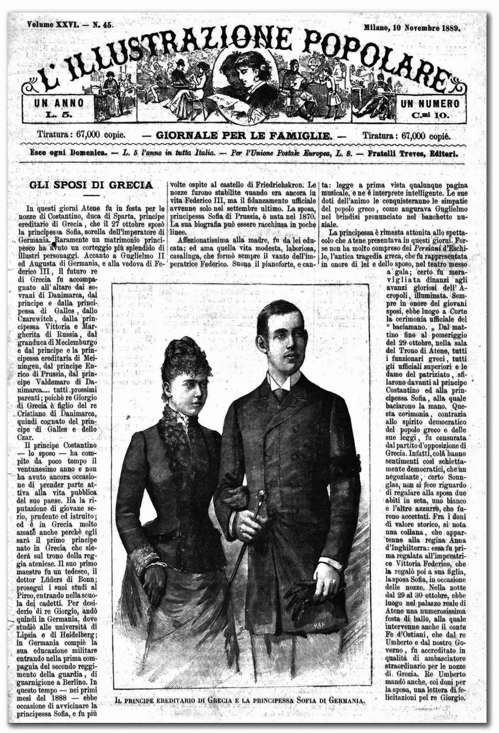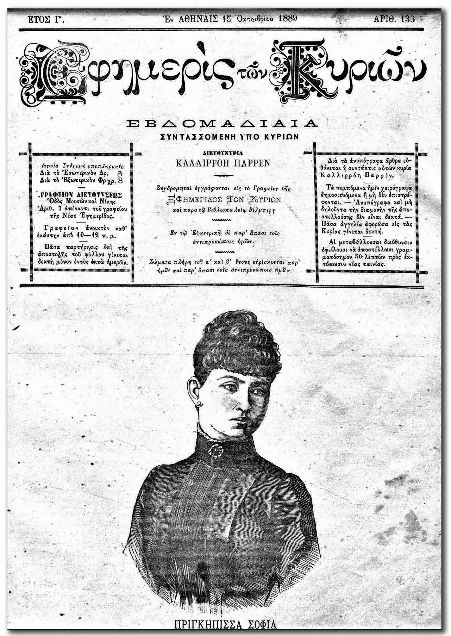 Η βασίλισσα Σοφία ήταν η τρίτη κατά σειρά βασίλισσα της Ελλάδας, σύζυγος του Κωνσταντίνου του Α’. Γεννήθηκε το 1870 και πέθανε το 1932. Ηταν κόρη του Φρειδερίκου Γ’ της Γερμανίας, αδελφή του Γουλιέλμου Β’ της Γερμανίας, καθώς και μητέρα τριών βασιλέων, του Γεωργίου Β’, του Αλέξανδρου και του Παύλου. Σε ηλικία 17 ετών στο Λονδίνο με αφορμή τον εορτασμό του Χρυσού Ιωβηλαίου της βασίλισσας Βικτωρίας θα γνωρίσει για πρώτη φορά, τον Ιούνιο του 1887, τον 19χρονο Κωνσταντίνο τότε διάδοχο του ελληνικού θρόνου. Ο γάμος του ζεύγους θα γίνει στις 15 Οκτωβρίου 1889 στη Μητρόπολη Αθηνών και ήταν η πρώτη φορά που τελέστηκαν πριγκιπικοί γάμοι στο ελληνικό κράτος.