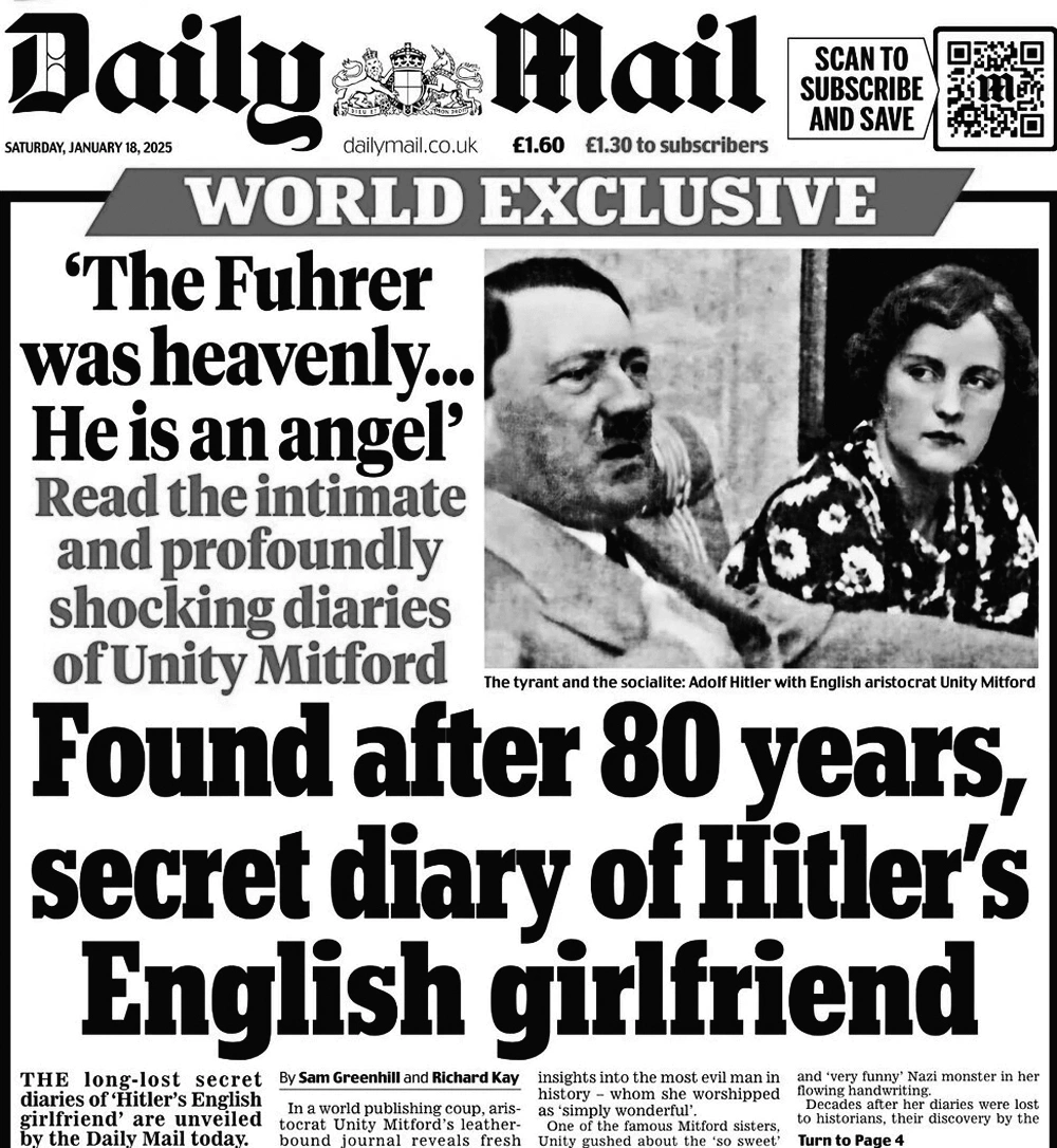 Ποιος θα το πίστευε ότι αυτά τα πολύ θερμά λόγια γράφτηκαν για τον πιο μισητό άνθρωπο της Ιστορίας, τον Αδόλφο Χίτλερ! Κι όμως, έτσι ακριβώς περιγράφει τον μεγάλο έρωτα της ζωής της η, άγνωστη στο ευρύ κοινό, Βρετανίδα ερωμένη του μεγαλύτερου σφαγέα της ανθρωπότητας στο ημερολόγιό της. Το έφερε κατ’ αποκλειστικότητα στο φως, 86 χρόνια μετά, η βρετανική εφημερίδα «Daily Mail», αφού πρώτα βεβαιώθηκε, όπως υποστηρίζει, με τη βοήθεια ειδικών γραφoλόγων και ιστορικών, ότι ήταν αυθεντικό και όχι πλαστό, όπως ανάλογα κείμενα του παρελθόντος.