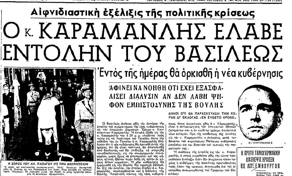 Ο ίδιος ο Κωνσταντίνος Καραμανλής σε παλαιότερη συνέντευξή του αρνείται όσα λέγονται περί βασιλικής εύνοιας στην εκλογή του λέγοντας: «Ούτε με τα Ανάκτορα ούτε με τους Αμερικάνους είχα σχέσεις και πολύ περισσότερο οικειότητα, ώστε η επιλογή να μπορεί να θεωρηθεί ότι επηρεάστηκε από αυτές. Δεν μπορώ βέβαια να ξεύρω τι συζητήσεις έκαμε ο βασιλεύς, αλλά δεν έχω καμία ένδειξη ευνοίας, ούτε του βασιλέως ούτε των Αμερικάνων προς το πρόσωπόν μου». Το μεσημέρι της 6ης Οκτωβρίου γίνεται η ορκωμοσία της νέας κυβέρνησης, η οποία παίρνει, τελικά, ψήφο εμπιστοσύνης από τη Βουλή στα μέσα Οκτωβρίου με 197 «ΝΑΙ», 97 «ΟΧΙ» και 19 απόντες, μεταξύ των οποίων και ο Στέφανος Στεφανόπουλος.
