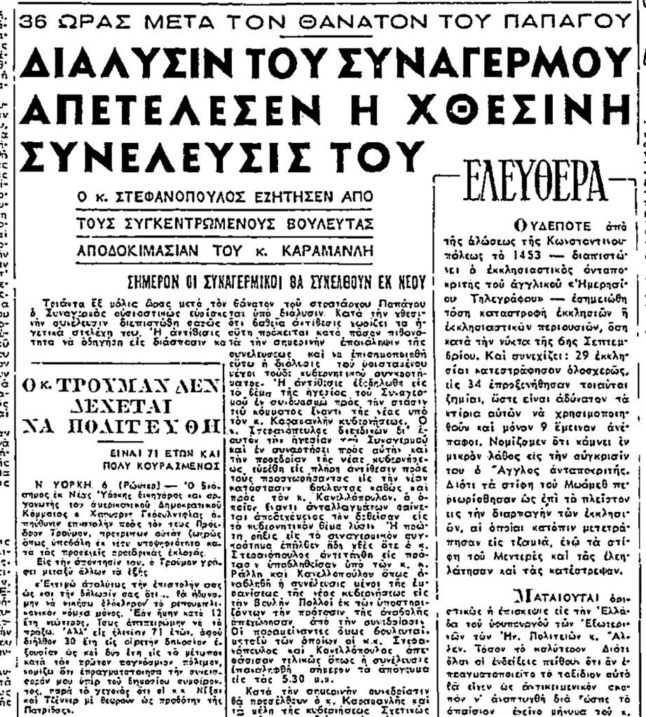 Ο Παπάγος δεν δέχεται το ανακτορικό αίτημα περί παραίτησης, συμβιβαζόμενος με τον διορισμό αντιπροέδρου στην κυβέρνηση για όσο διάστημα αυτός είναι ασθενής. Ο διορισμός σε αυτήν τη θέση του Στέφανου Στεφανόπουλου το απόγευμα της 3ης Οκτωβρίου οδηγεί τον έτερο διεκδικητή, Παναγιώτη Κανελλόπουλο, στην παραίτηση, αμφισβητώντας στην πράξη την εγκυρότητα του διορισμού από τον άρρωστο πρωθυπουργό. Επειδή, όμως, όταν οι άνθρωποι κάνουν σχέδια ο Θεός γελάει, έτσι, η νέα ανατροπή του σκηνικού έρχεται το βράδυ της επόμενης ημέρας με τον αιφνίδιο θάνατο του Παπάγου.