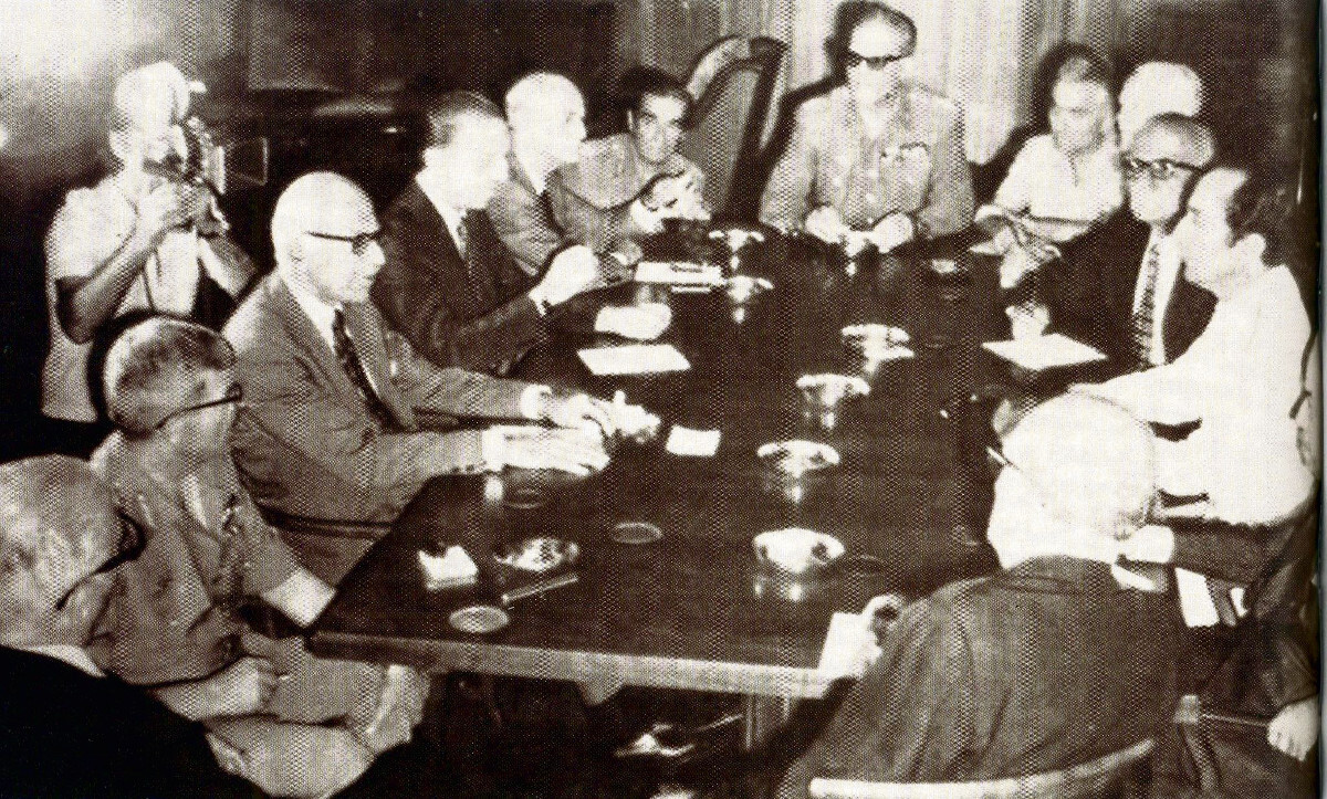 Η σύσκεψη αρχίζει το μεσημέρι, 1.30, και σ’ αυτήν ο Γκιζίκης ουσιαστικά αναθέτει εν λευκώ τον σχηματισμό κυβέρνησης στους πολιτικούς, υποσχόμενος, μάλιστα, ότι ο Ιωαννίδης δεν θα δημιουργήσει προβλήματα στην ομαλή μετάβαση. Στη σύσκεψη αποφασίζεται ότι ο πρωθυπουργός που θα οδηγήσει τη χώρα σε εκλογές θα είναι ο Παναγιώτης Κανελλόπουλος με τη συνεργασία του Γεωργίου Μαύρου, δίνοντας, έτσι, τον συμβολισμό πως η πολιτική ζωή του τόπου συνεχίζεται από εκεί που διακόπηκε βίαια στις 21 Απριλίου 1967.