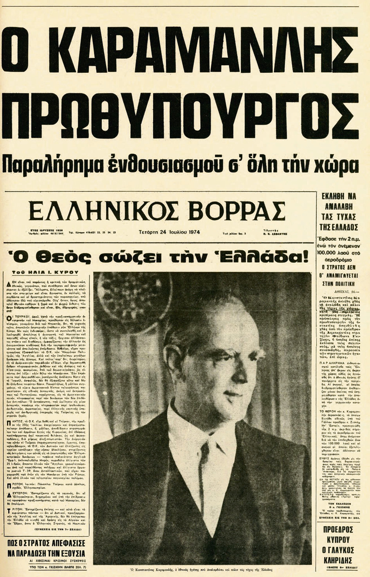Οταν το πρωθυπουργικό δικινητήριο τζετ «Μίστερ 2» προσγειώνεται στις 02.10 στο αεροδρόμιο του Ελληνικού, ο Κωνσταντίνος Καραμανλής συνειδητοποιεί ότι δεν προλαβαίνει ούτε να συγκινηθεί για την επιστροφή του όπως φανταζόταν: «Συχνά σκεπτόμουν τη συγκίνηση που θα δοκίμαζα όταν θα ξαναπατούσα το έδαφος της πατρίδος. Και μπορώ να σας αποκαλύψω ότι με τη σκέψη αυτή εδάκρυζα προκαταβολικά. Και όμως, ουδέποτε υπήρξα τόσο ψύχραιμος, ουδέποτε είχα τόση αυτοκυριαρχία όσο τη στιγμή που έφτανα στο αεροδρόμιο. Και αυτό, γιατί το αίσθημα των ευθυνών που επρόκειτο να αναλάβω ήταν τόσο έντονο, ώστε να πνίγει, να εξαφανίζει κάθε άλλο αίσθημα».