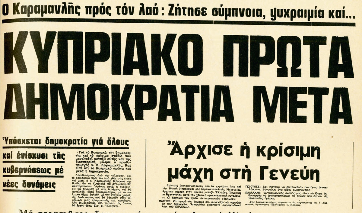 Παράλληλα κλείνει άμεσα το στρατόπεδο συγκέντρωσης της Γυάρου, σταδιακά επιστρέφουν από το εξωτερικό οι πολιτικοί ηγέτες της Αριστεράς μαζί με πολιτικούς εξόριστους του Εμφύλιου Πολέμου, ενώ στις 23 Σεπτεμβρίου δημοσιεύεται το υπ’ αριθμ. 59 νομοθετικό διάταγμα περί επαναλειτουργίας των πολιτικών κομμάτων που καταργούσε τον νόμο 509/47 που διατηρεί παράνομο το ΚΚΕ. Η επανέκδοση του «Ριζοσπάστη» και της «Αυγής» τον Σεπτέμβριο, καθώς και η σύμπραξη όλων των αριστερών δυνάμεων (ΕΔΑ, ΚΚΕ, ΚΚΕ εσωτ.) στις πρώτες δημοκρατικές εκλογές της 17ης Νοεμβρίου 1974, σηματοδοτεί ότι η νέα Δημοκρατία που ξεκινά θα στηριχθεί σε όλα της τα πόδια και δεν θα είναι κουτσή…