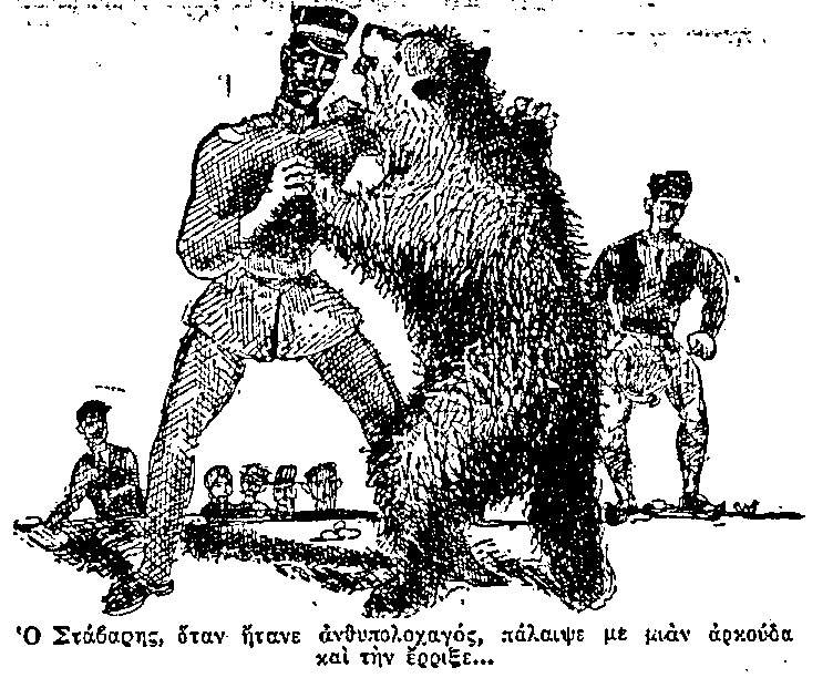 Αντίστοιχο ανατρεπτικό σκηνικό καταγράφει ο στρατιωτικός Χριστόδουλος Τσιγάντες (1897-1970). Στις αρχές του προηγούμενου αιώνα κάποιος γεροδεμένος ανθυπολοχαγός ονόματι Στάβαρης , όταν συναντά έναν πλανόδιο αρκουδιάρη στην περιοχή της Δεξαμενής στο σημερινό Κολωνάκι του ζητά, για άγνωστο λόγο, να παλέψει με την αρκούδα του…Στην πάλη που ακολουθεί ο Στάβαρης βγαίνει νικητής αλλά τα προβλήματα του δεν τελειώνουν εκεί. Όταν το Φρουραρχείο μαθαίνει για την παράδοξη αυτή μονομαχία τον τιμωρεί διότι “επιλήσμων γενόμενων των υποχρεώσεων του προς την στολήν του αξιωματικού επάλεψε μετ’ άρκτου”. Το εντυπωσιακό είναι ότι εν συνεχεία ο Στάβαρης όχι μόνο δεν συνετίζεται αλλά διαμαρτύρεται όχι για την τιμωρία αλλά διότι δεν έχει προστεθεί στο αιτιολογικό της το “καταβαλών ταύτην”…