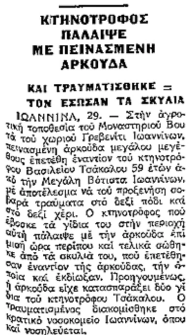 Στον Τύπο του 20ού αιώνα βρίσκουμε αρκετές καταγραφές επεισοδίων, άλλοτε δραματικών και άλλοτε… κωμικών. Το φθινόπωρο του 1976 έχουμε επίθεση πεινασμένης αρκούδας μεγάλου μεγέθους σε κτηνοτρόφο στο χωριό Γρεβενίτη Ιωαννίνων. Ακολουθεί πάλη διάρκειας μισής ώρας, σύμφωνα με τον παθόντα, ο οποίος σώζεται χάρη στα σκυλιά του έχοντας όμως τραυματιστεί σοβαρά στο δεξί χέρι και πόδι.