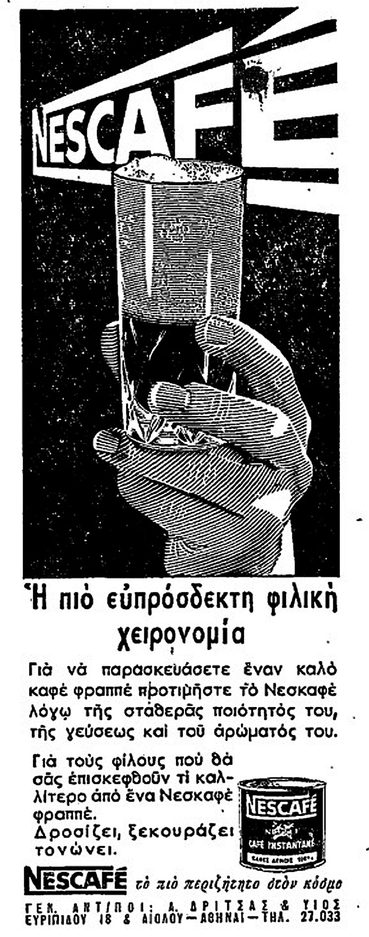 Τέλος, στη Β’ Εκθεση Σύγχρονου Σπιτιού στο Ζάππειο, το 1961, ανάμεσα σε διάφορες πρωτοεμφανιζόμενες ηλεκτρικές μηχανές οικιακής χρήσης (μίξερ για παγωτά, κρεατομηχανή κ.λπ.) βρίσκουμε να παρουσιάζεται το πρώτο μηχάνημα, που γνωρίζουμε εμείς, στην Ελλάδα παρασκευής καφέ φραπέ.
