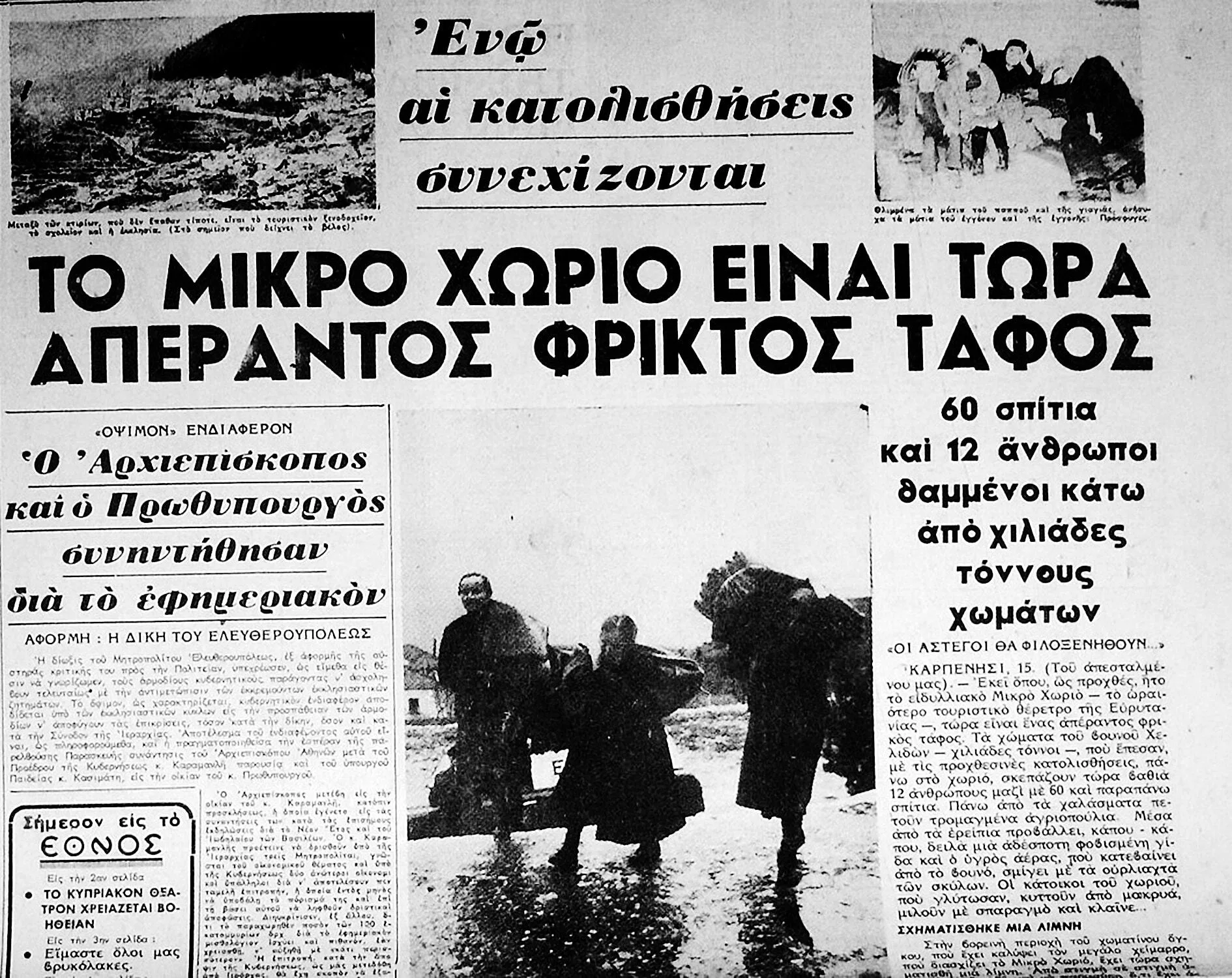 Μέσα σε ελάχιστη ώρα το μεγαλύτερο μέρος του χωριού πέφτει σε τεράστια χαίνοντα ρήγματα ή καταπλακώνεται κάτω από 250 χιλιάδες τόνους χωμάτων και βράχων, παίρνοντας μαζί του 13 κατοίκους, πάνω από τα μισά σπίτια του οικισμού, ενώ τα υπόλοιπα έχουν μεγάλες ζημιές, ενώ σημαντική είναι και η οικολογική καταστροφή, αφού χάνονται μεμιάς πάνω από 30.000 έλατα. Τα συντρίμμια σκεπάζονται από μια εφιαλτική κόκκινη ομίχλη από σκόνη και κοκκινόχωμα. Το φρικιαστικό τοπίο ολοκληρώνεται με σκόρπιους ήχους από σπαρακτικές ανθρώπινες φωνές και μουγκρητά τραυματισμένων ζώων. Η τραγωδία θα ήταν ακόμη μεγαλύτερη αν την ώρα της κατολίσθησης οι περισσότεροι κάτοικοι δεν βρίσκονταν στην εκκλησία για την κυριακάτικη Λειτουργία, μαζί με 40 παιδιά, που τα διασώζει εκεί την τελευταία στιγμή ο δάσκαλος. Το όνομα της εκκλησίας; Αγιος Σώστης…