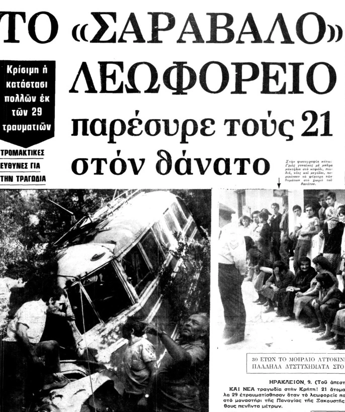Πολύ πριν από όλα αυτά, όμως, σε έναν ορεινό δρόμο της Κρήτης, ένα μικρό χωριό πλήρωσε σκληρά το τίμημα της ελληνικής αμέλειας, της κακής οδικής νοοτροπίας και ενός οχήματος που δεν έπρεπε να κυκλοφορεί. Είναι Παρασκευή 8 Σεπτεμβρίου 1972, όταν η Καλαμάφκα της Ιεράπετρας βυθίστηκε στο πένθος. Κάθε χρόνο, ανήμερα της Παναγίας, πλήθος πιστών από τα γύρω χωριά ανηφόριζε στο μοναστήρι της Παναγίας της Ξακουστής, ένα από τα πιο όμορφα μοναστήρια της ανατολικής Κρήτης. Εκείνο το πρωινό, ένα λεωφορείο του ΚΤΕΛ, χωρητικότητας μόλις 24 θέσεων, ξεκίνησε από την Καλαμάφκα φορτωμένο με σχεδόν διπλάσιο αριθμό επιβατών. Οι μαρτυρίες διαφέρουν: άλλοι μιλούν για 49, άλλοι για 51 ανθρώπους στοιβαγμένους μέσα. Όλοι συγχωριανοί. Οικογένειες ολόκληρες. Παιδιά, ηλικιωμένοι, γυναίκες με μαντήλες και άντρες ντυμένοι για τη γιορτή.