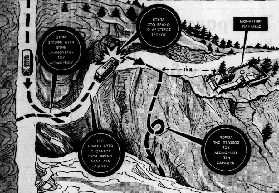 Στο νοσοκομείο ο 53χρονος οδηγός, πριν πέσει σε κώμα, ψιθυρίζει: «Δεν είχα φρένα. Μου κόπηκαν μόλις πήρα την τελευταία στροφή για την Παναγιά», ενώ ο τραυματισμένος εισπράκτορας προσθέτει :«Κόλλησε το τιμόνι. Με κολλημένο τιμόνι πήγαμε κατευθείαν στο βάραθρο. Αυτό το λεωφορείο ήθελε πέταμα».